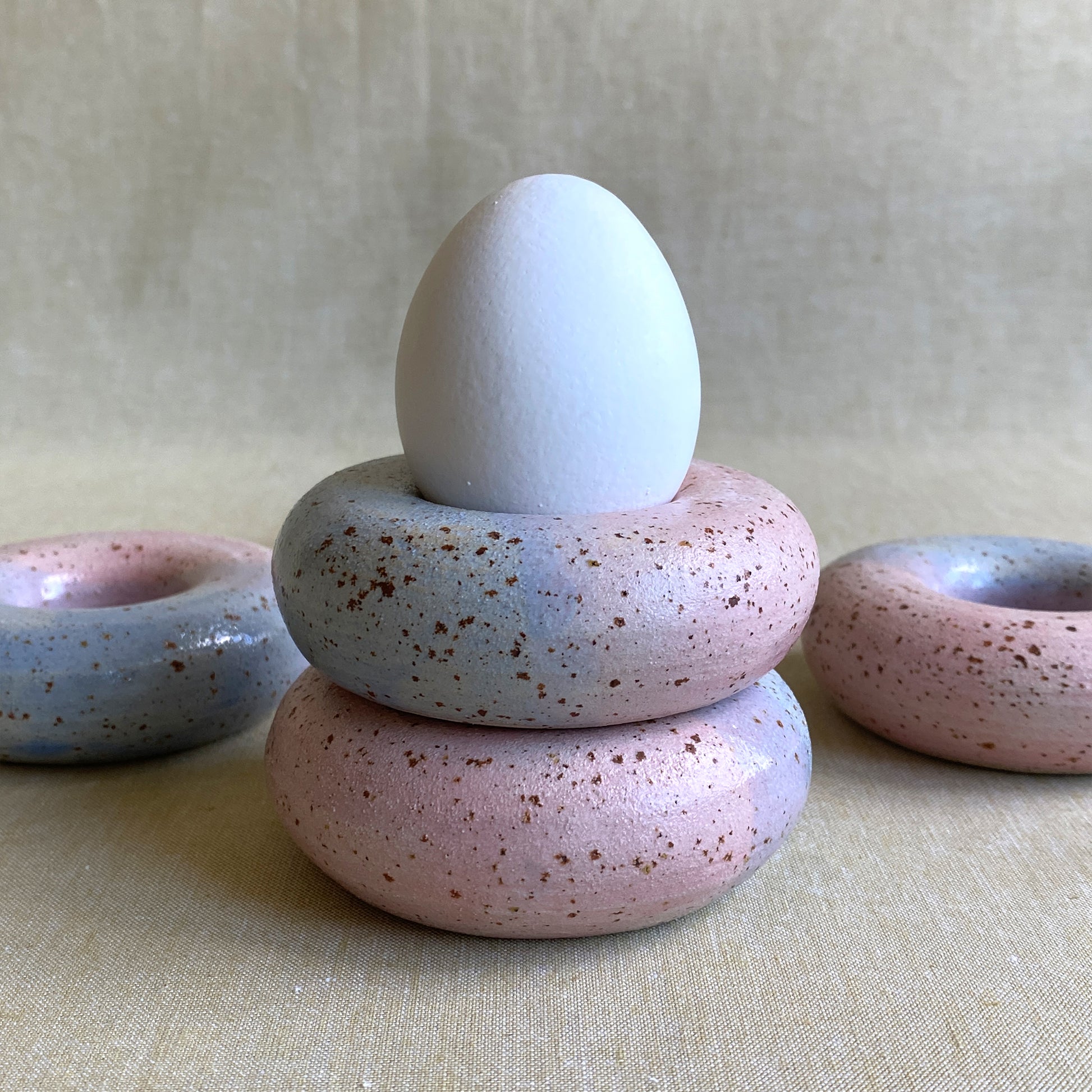 Satin Sunrise är en äggkopp i lavalera vars glasyr går som en rosa-lila-blå gradient över formen. Äggkoppen är handdrejad och ger en härlig pastellklick till köksbordet.