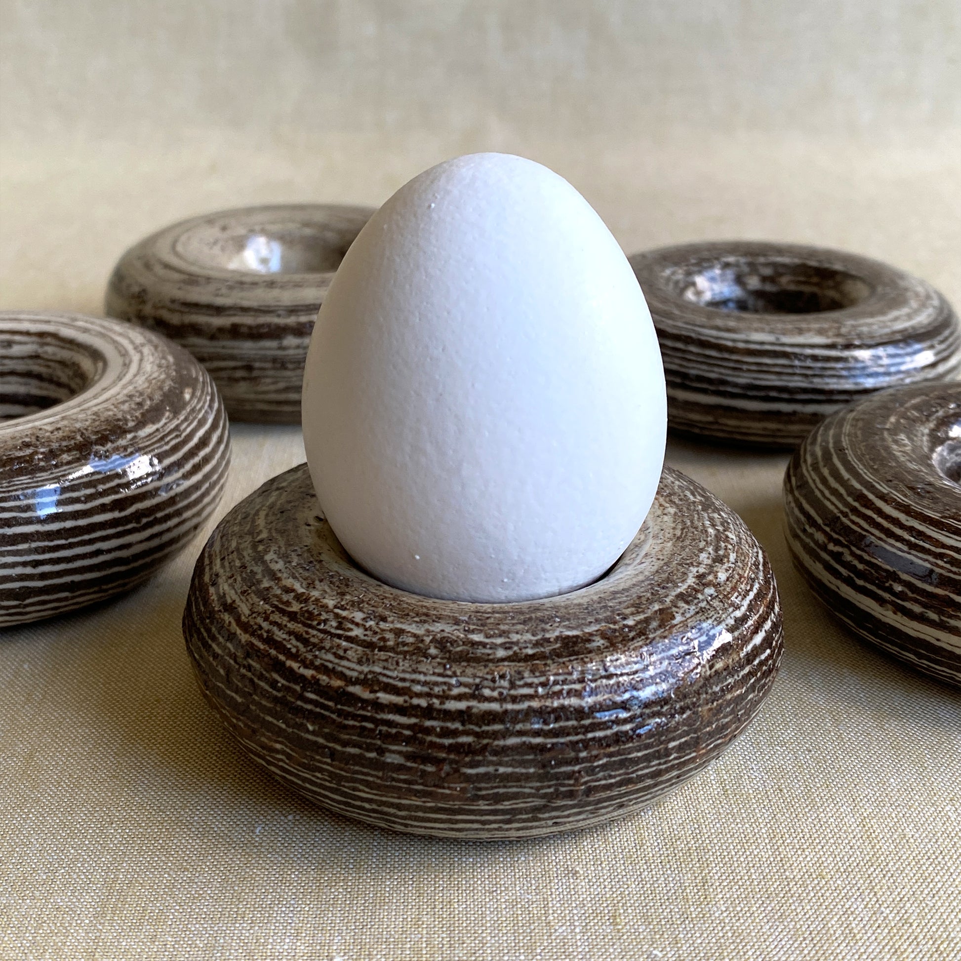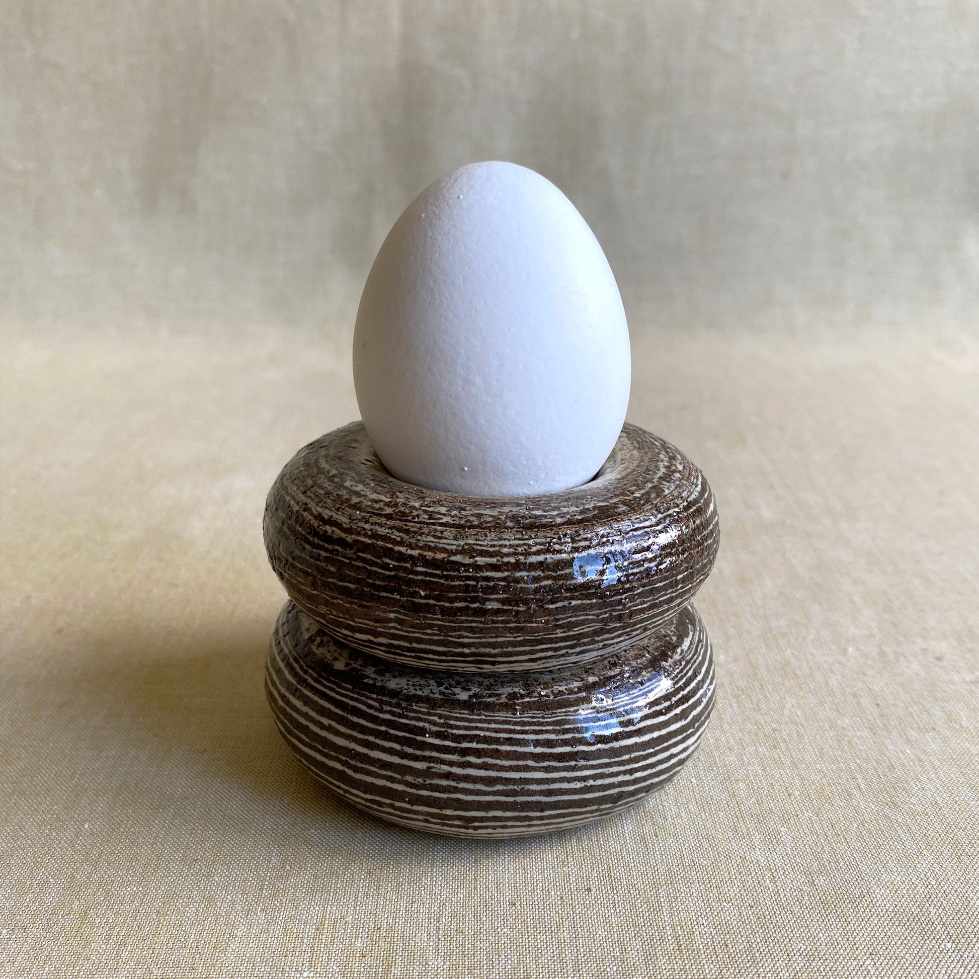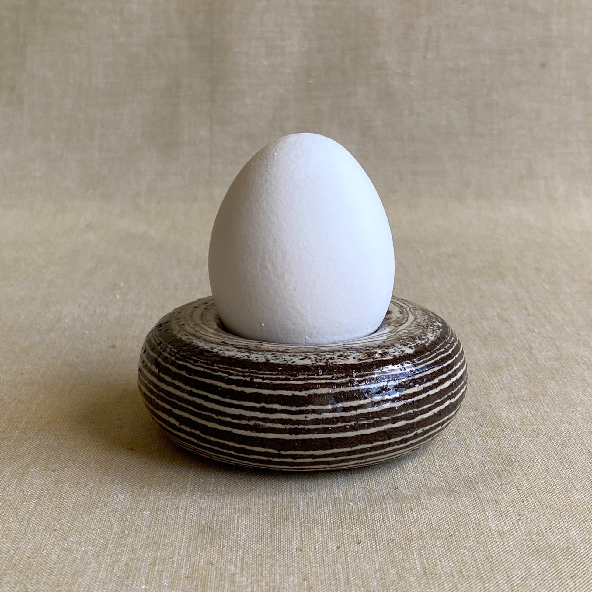 Äggkoppen Zebra är en unik liten äggkopp där två olikfärgade leror – vit och mörkbrun – har drejats ihop och på så sätt bildat det randiga mönstret i äggkoppen. Lerorna är chamotterade och grova i sin känsla, men med en blank transparent glasyr över känns äggkopparna lena mot handen.