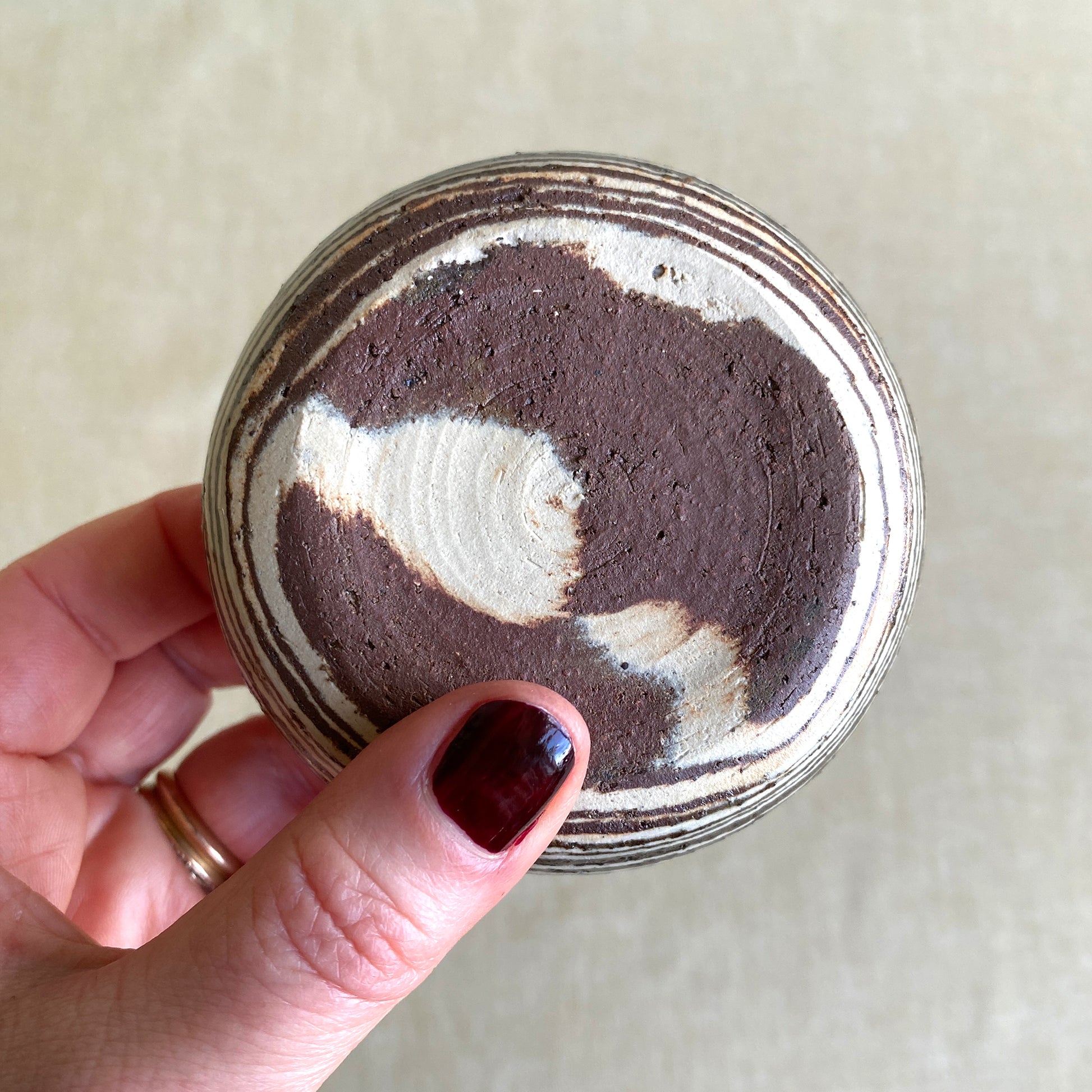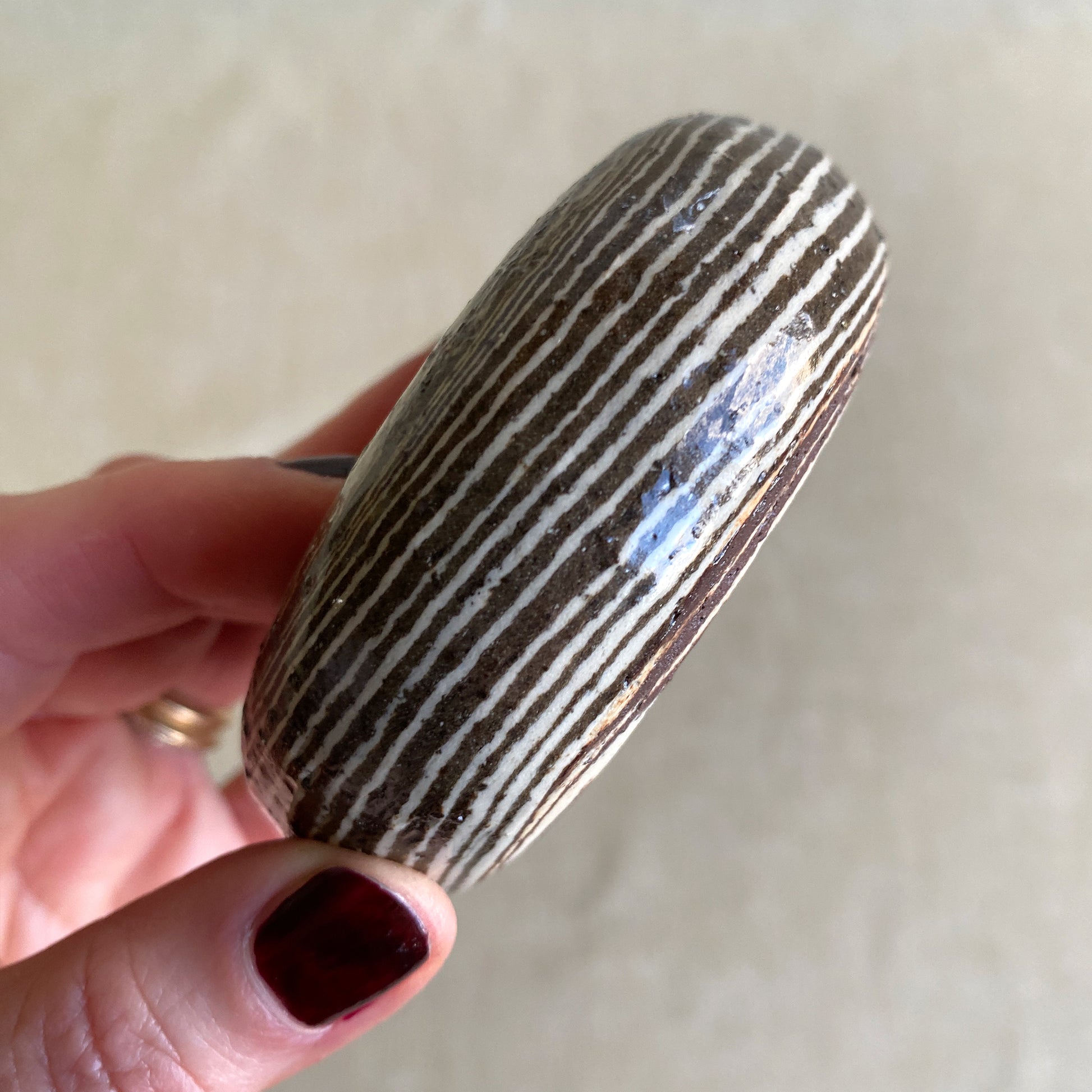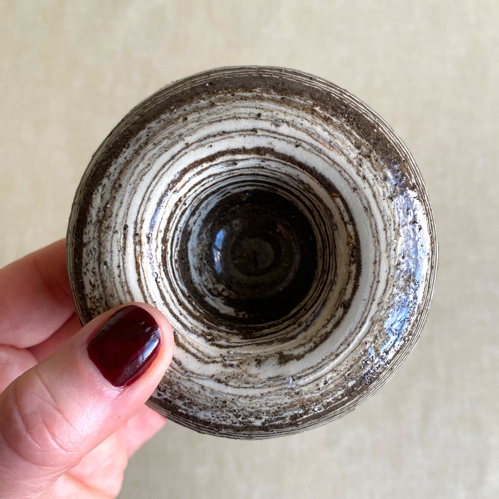 Äggkoppen Zebra är en unik liten äggkopp där två olikfärgade leror – vit och mörkbrun – har drejats ihop och på så sätt bildat det randiga mönstret i äggkoppen. Lerorna är chamotterade och grova i sin känsla, men med en blank transparent glasyr över känns äggkopparna lena mot handen.