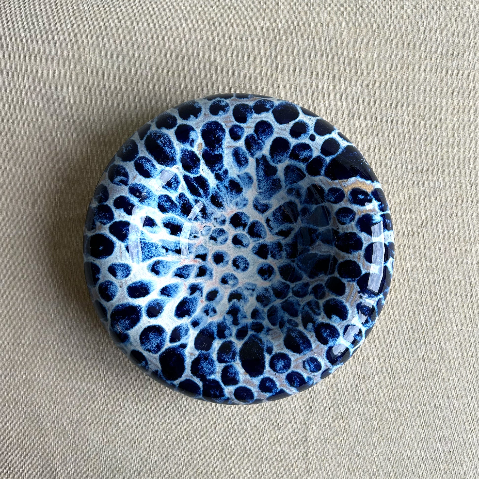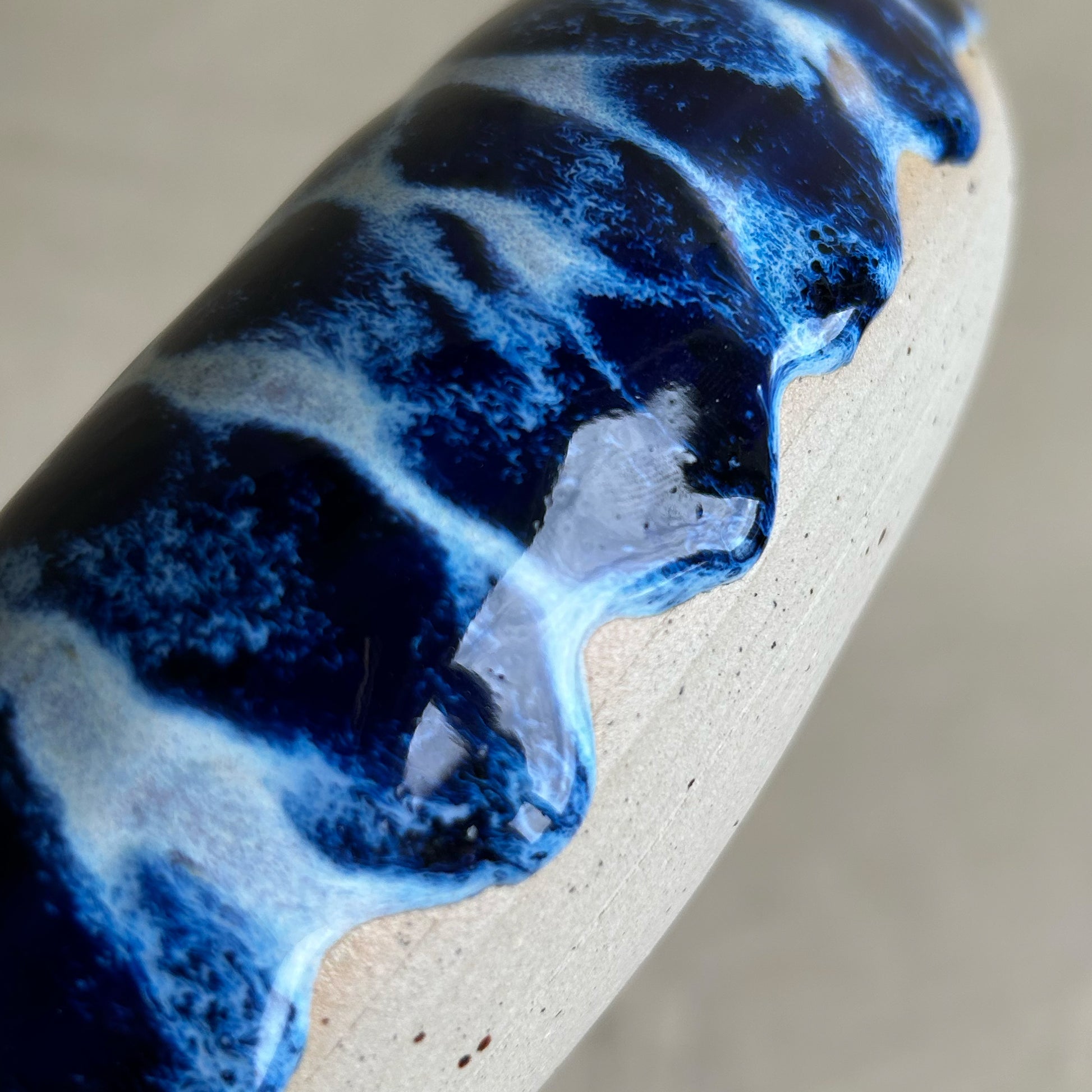 Som en målning där färgerna har smält samman i ett hypnotiskt flöde. Blue Leopard är ett handgjort konstverk i keramik, med en levande glasyr i mjuka skiftningar av gröna, blå och gyllene toner.