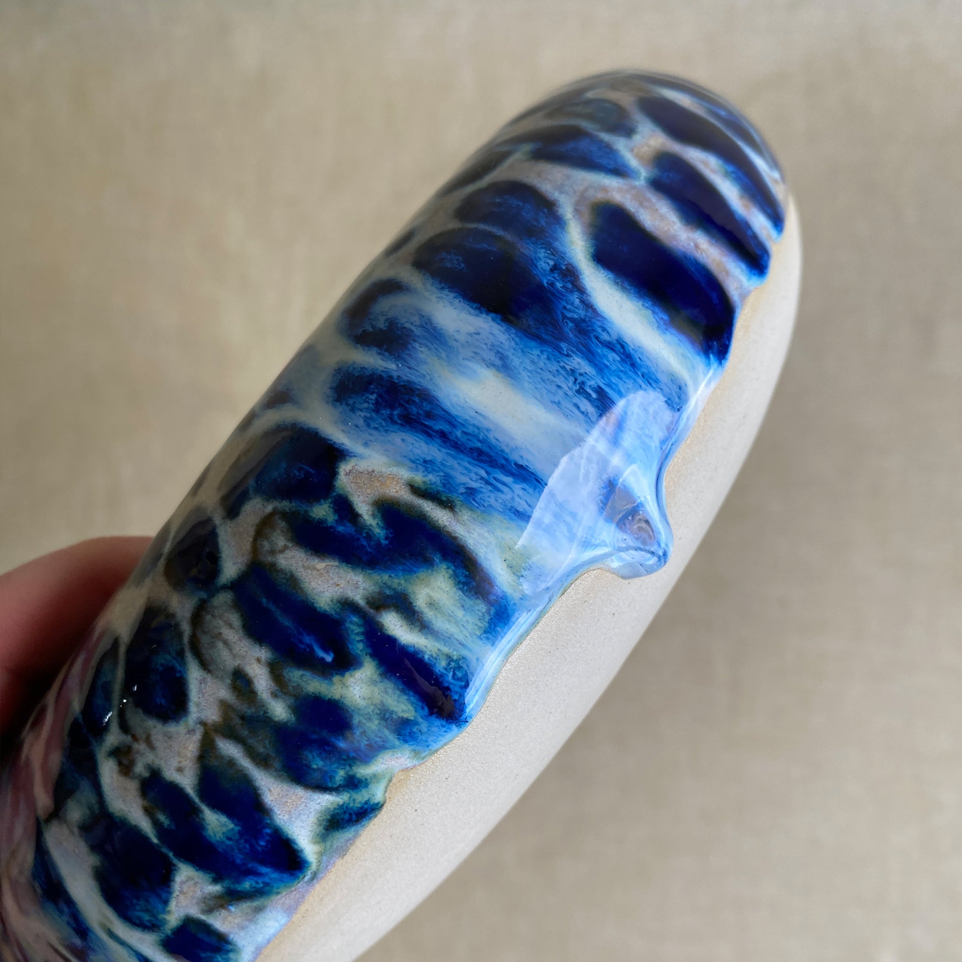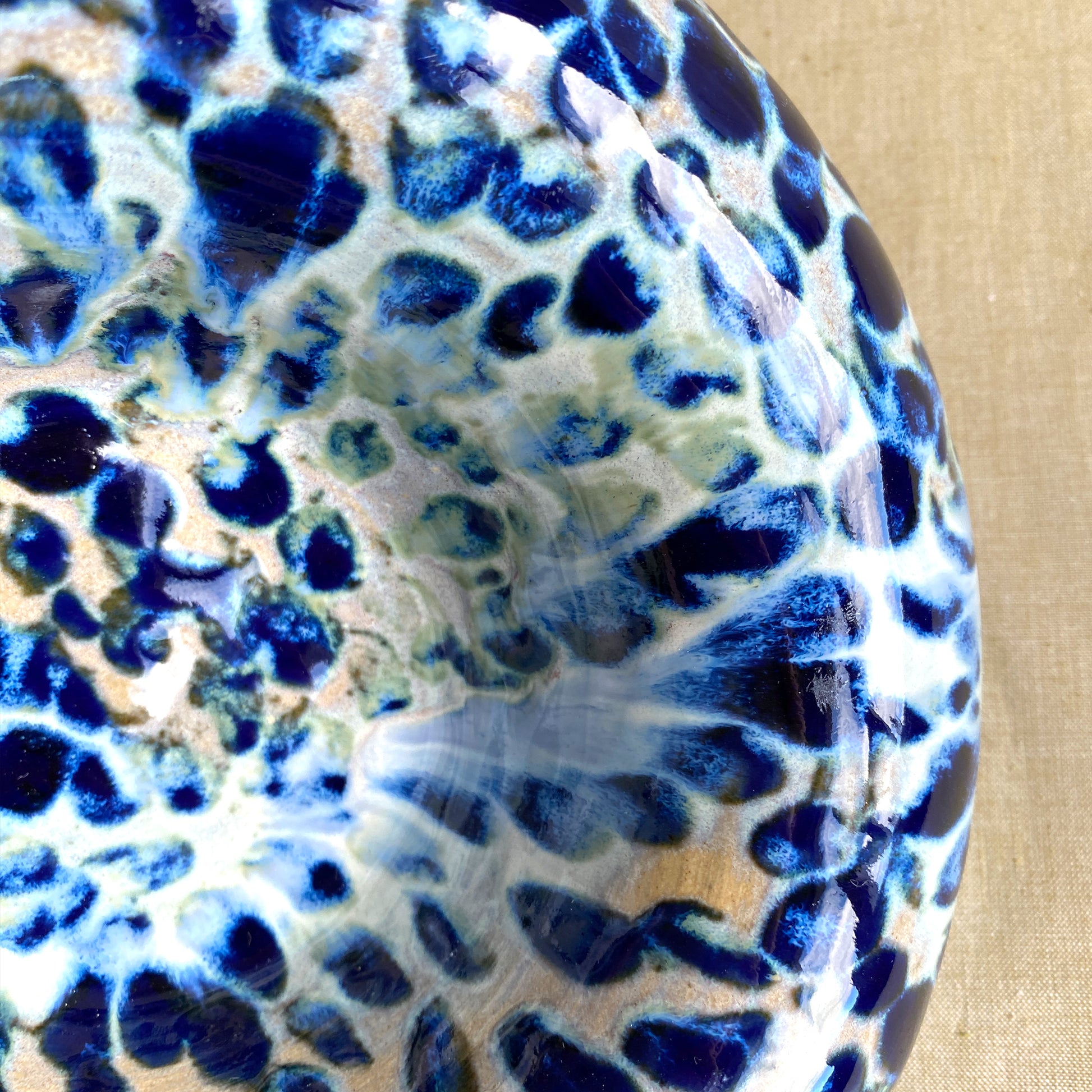 Som en målning där färgerna har smält samman i ett hypnotiskt flöde. Blue Leopard är ett handgjort konstverk i keramik, med en levande glasyr i mjuka skiftningar av gröna, blå och gyllene toner.