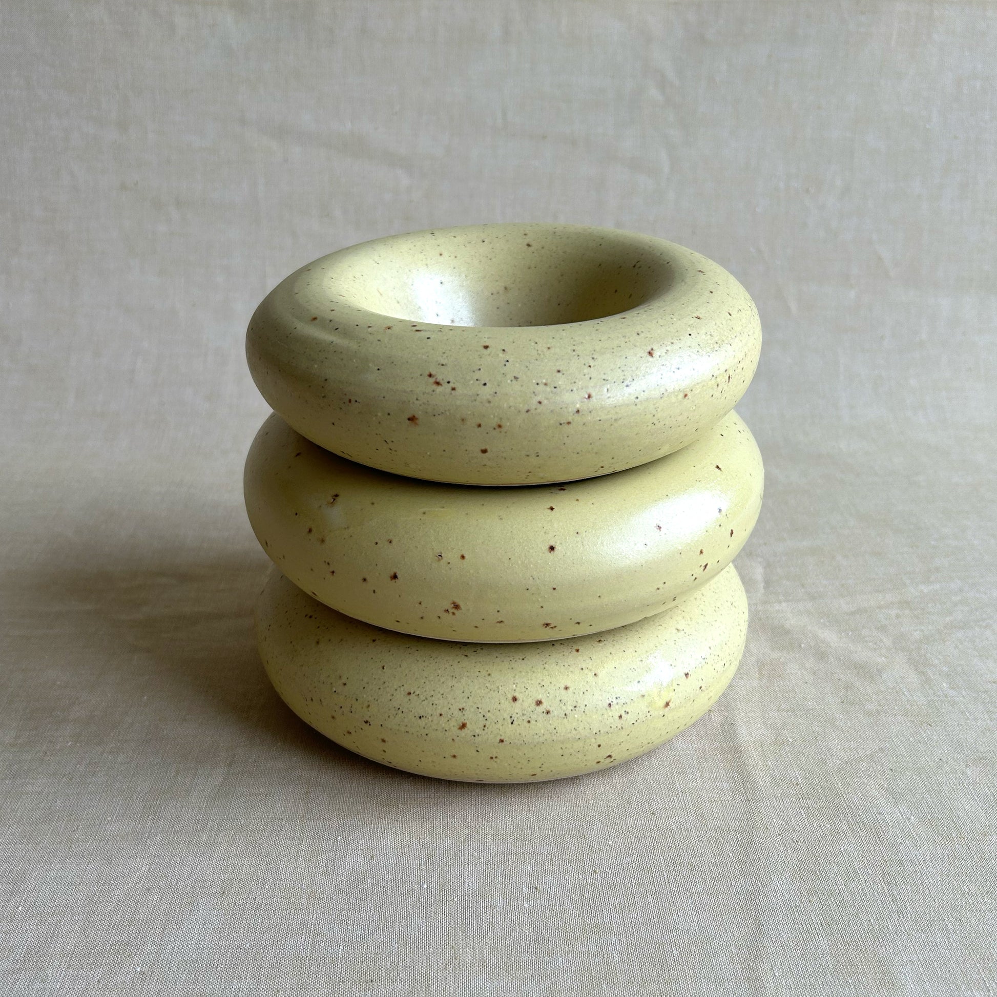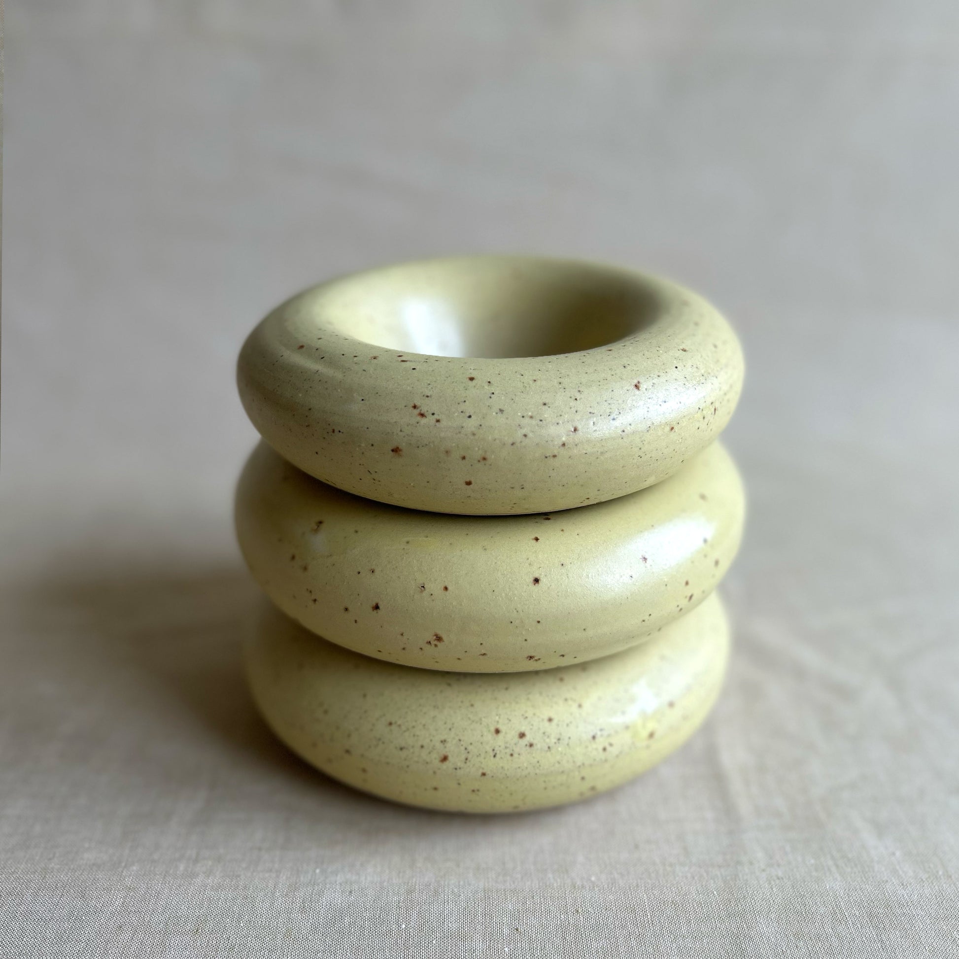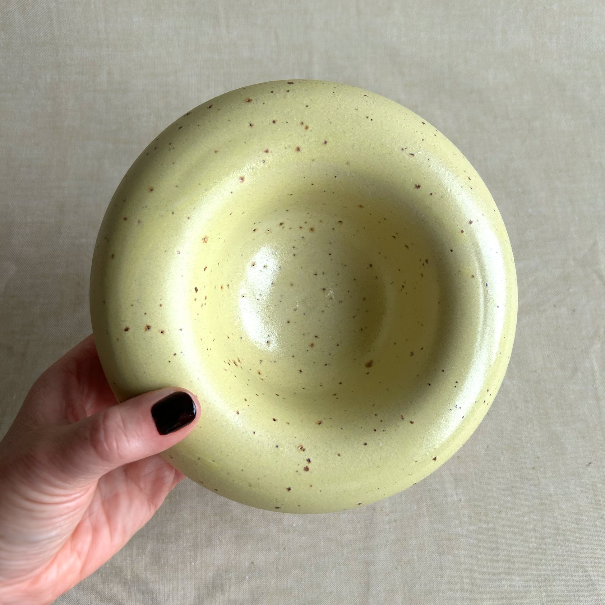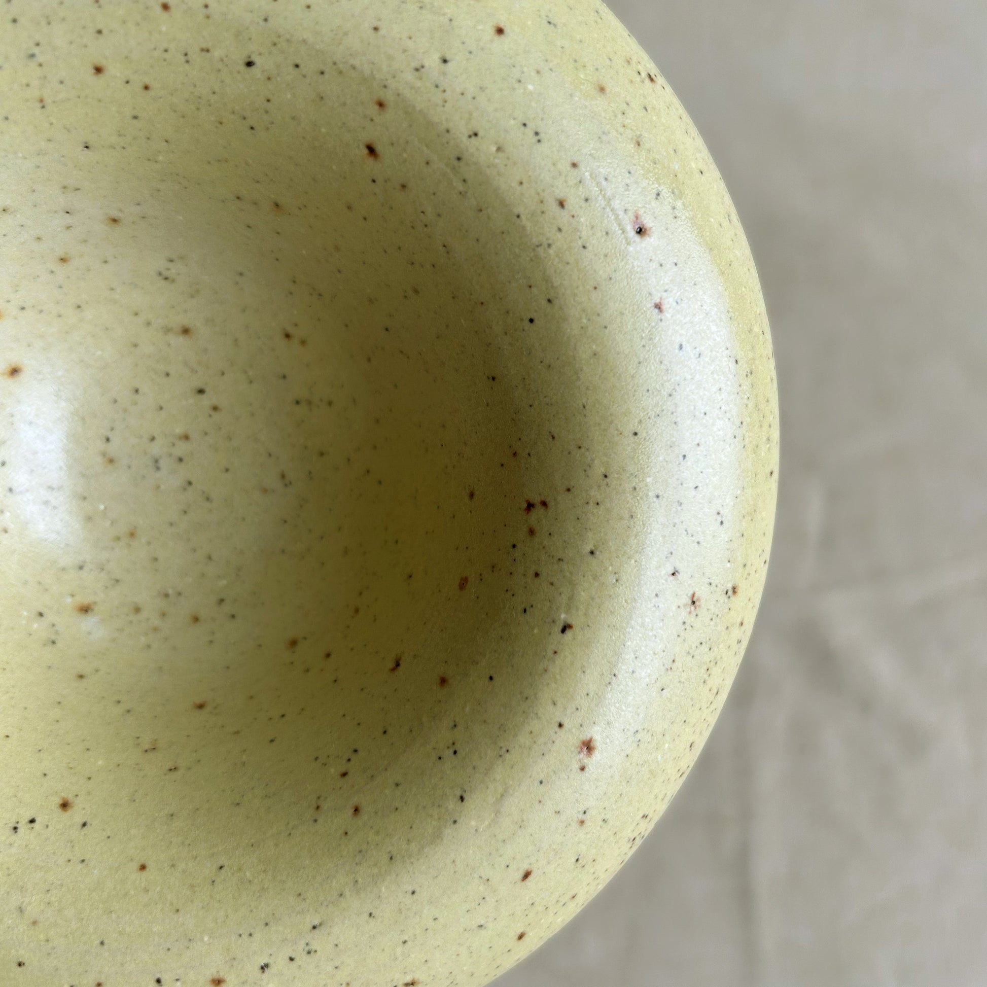 Lemon Lava är en drejad skål i stengodslera, där lavaprickarna i leran skapar skymtar igenom den matta gula glasyren – en citrongul skål med vulkanisk karaktär.