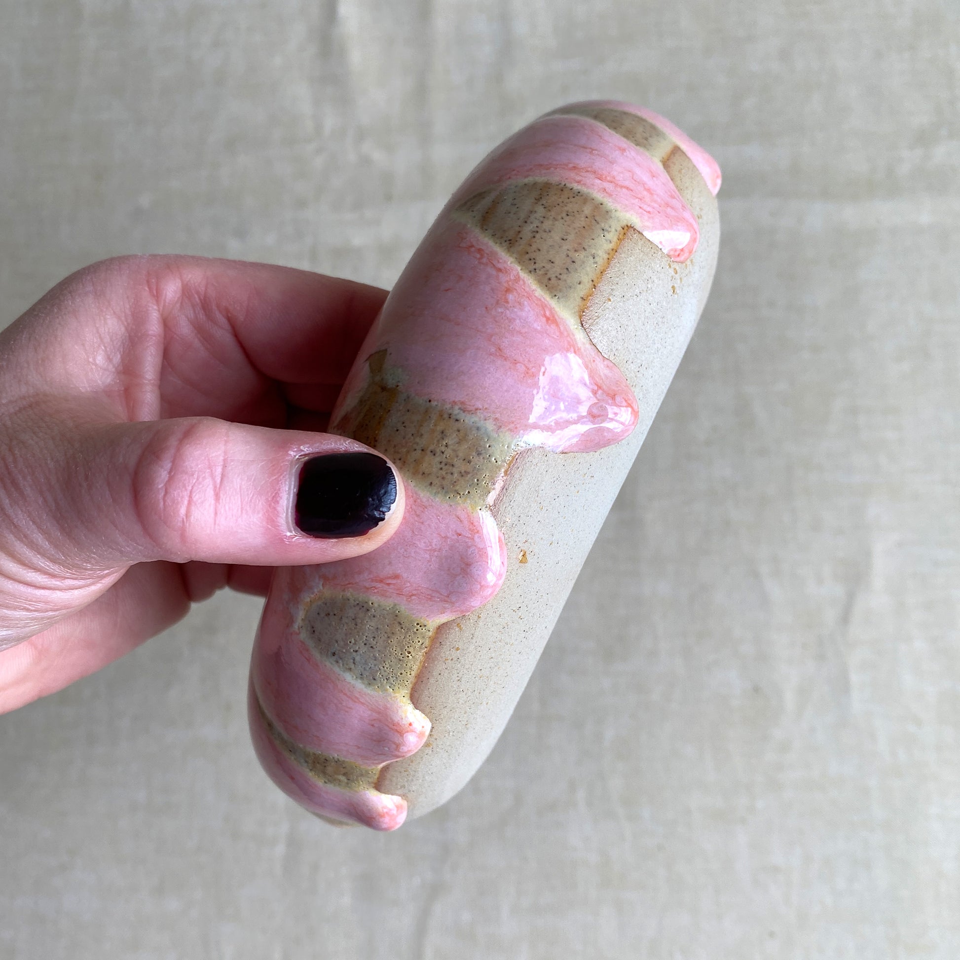 Sorbet Swirl är en unik keramikskål med en glasyr som påminner om smält glass – mjuka rosa och orangea toner flyter samman med citrongula inslag och skapar ett lekfullt, organiskt mönster. En form som är både skulptural och funktionell, perfekt som smyckesförvaring, serveringsskål eller en unik detalj i ditt hem.