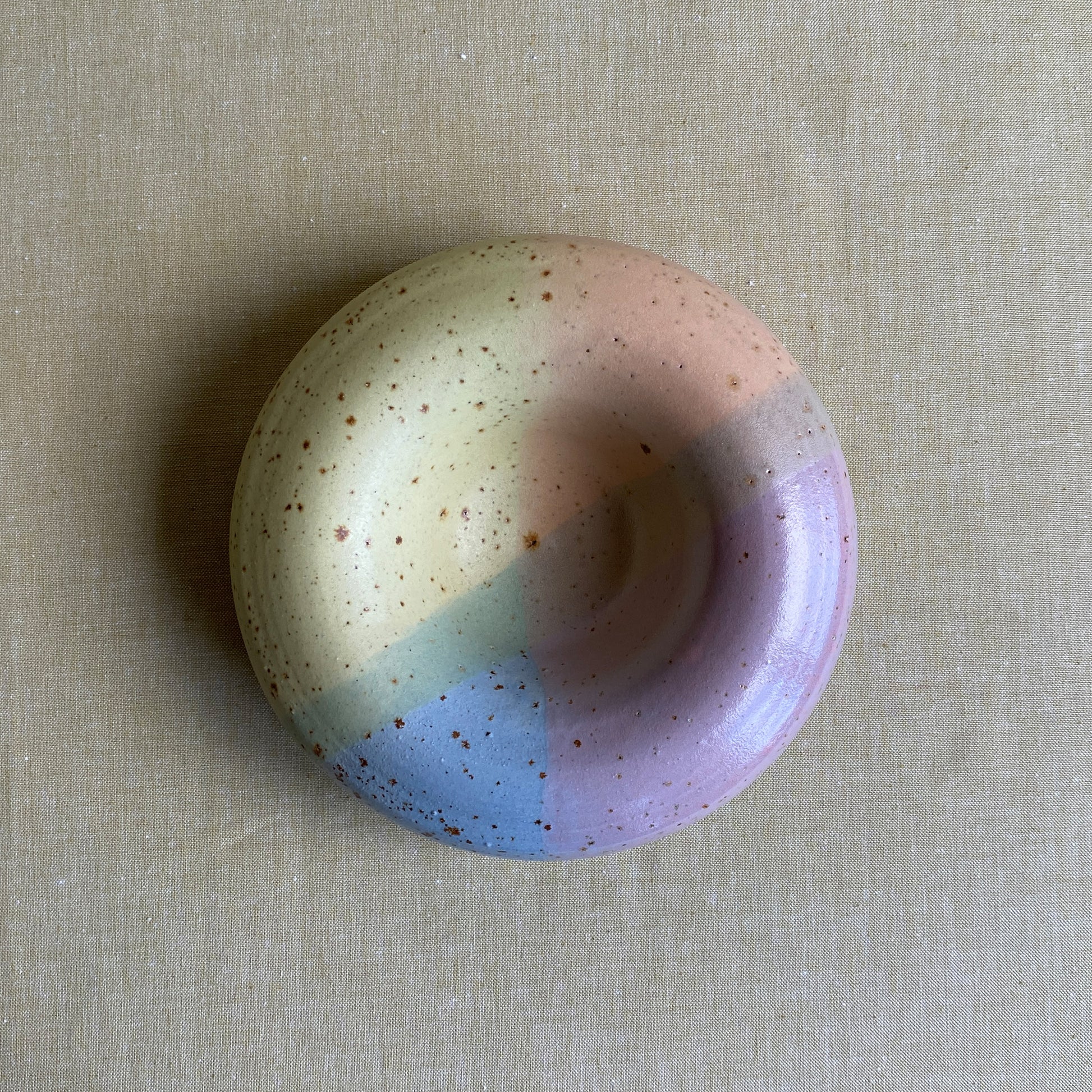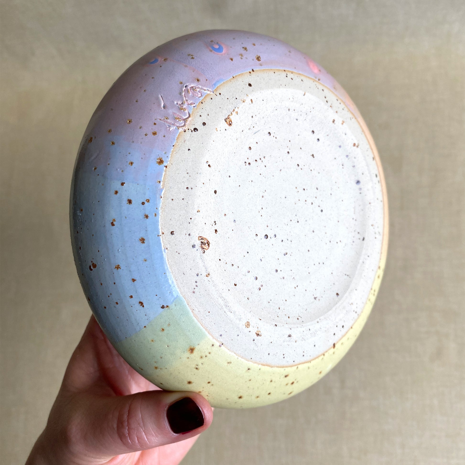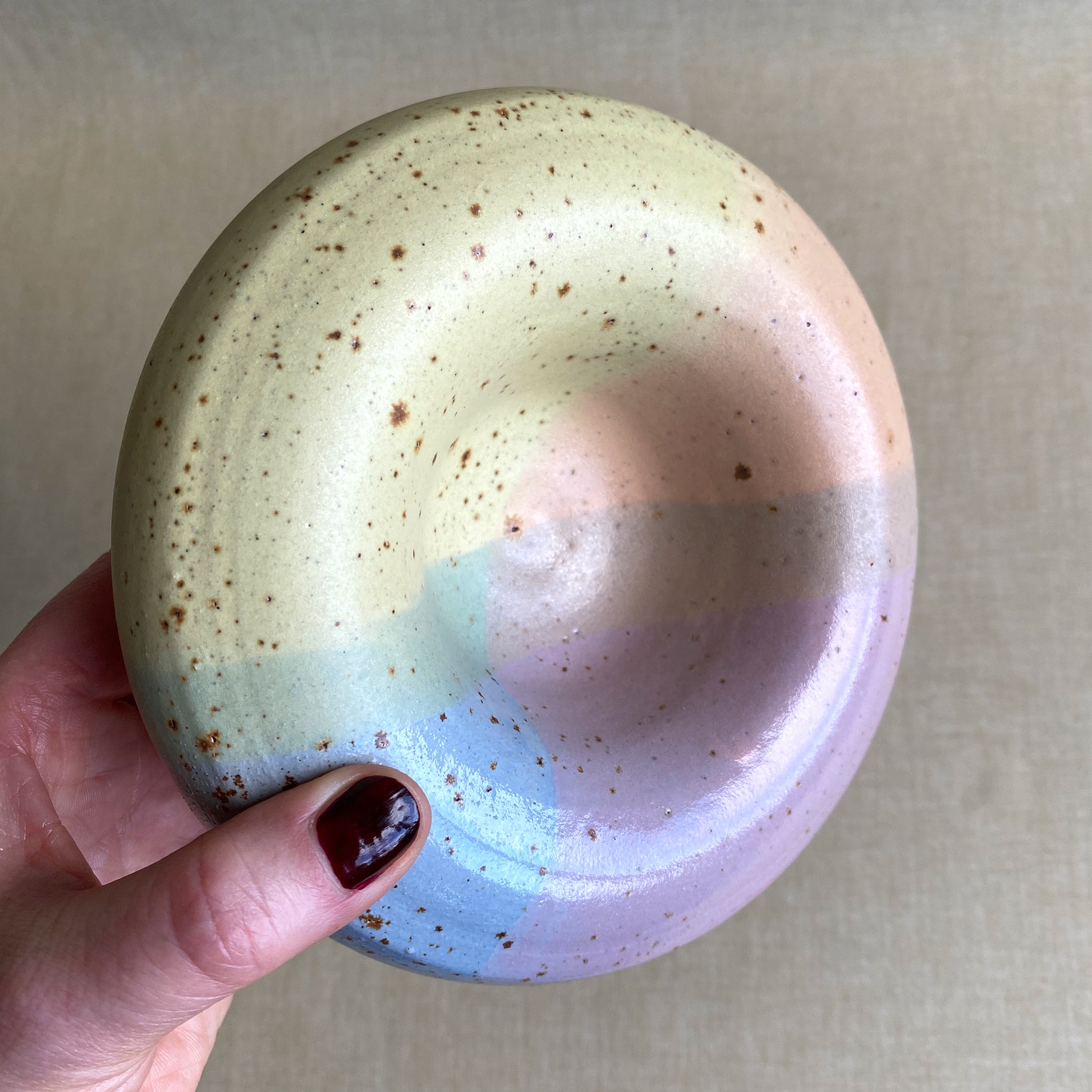 Rainbow Fade är en bullig keramikskål doppats i tre olika glasyrer för att skapa en subtil regnbågseffekt. De mjuka tonerna av rosa, blått och gult smälter samman, medan små lavaprickar i leran ger en extra dimension och livfullhet.