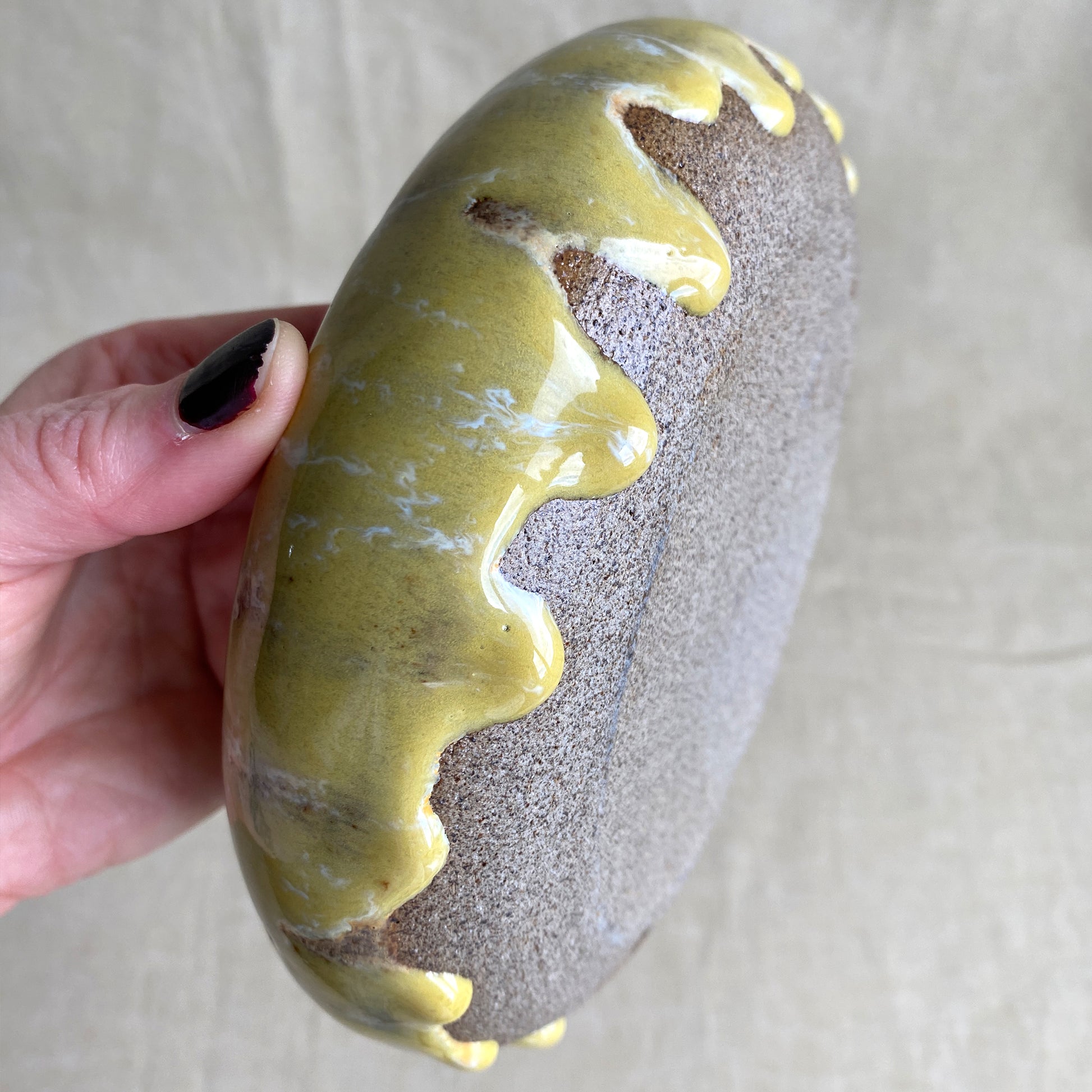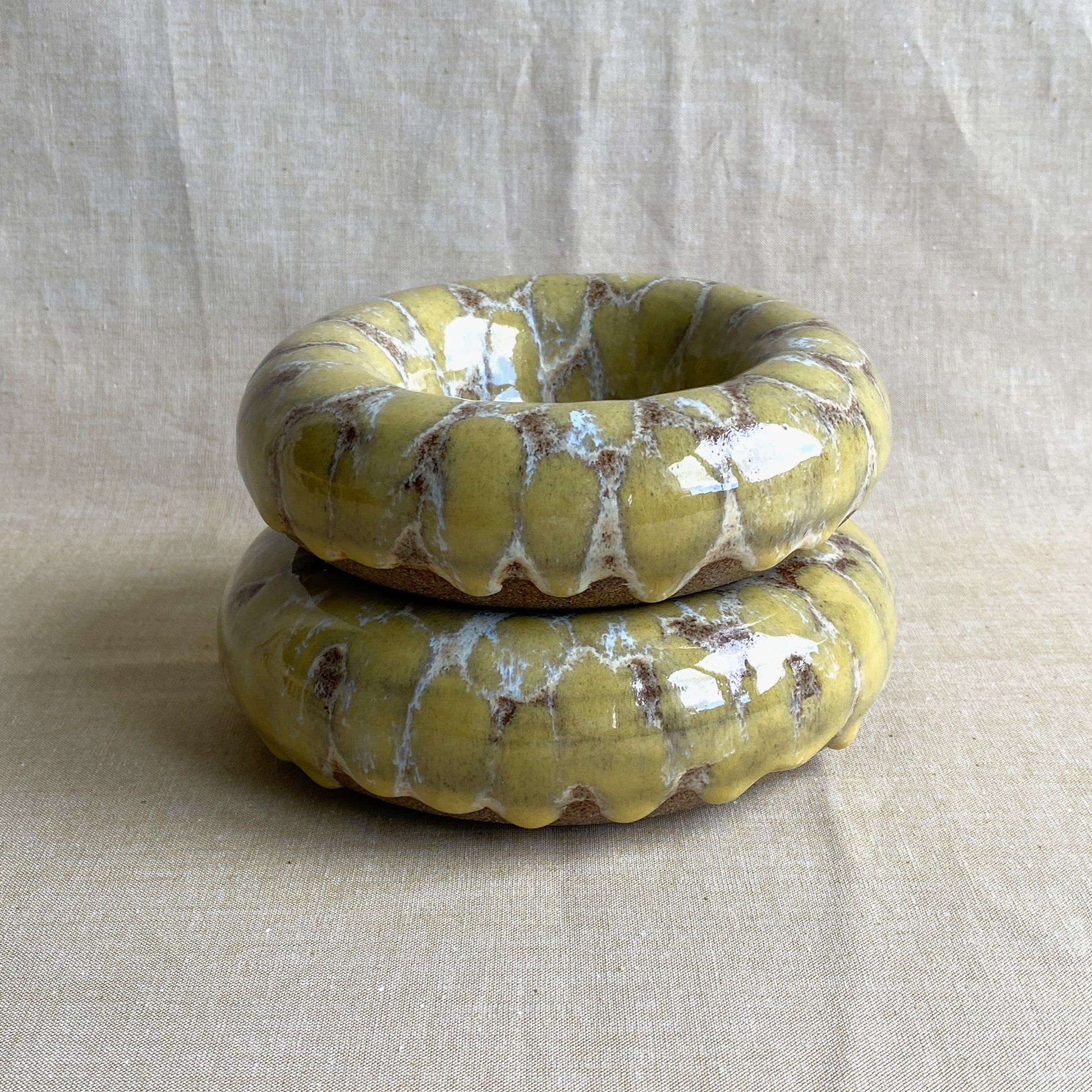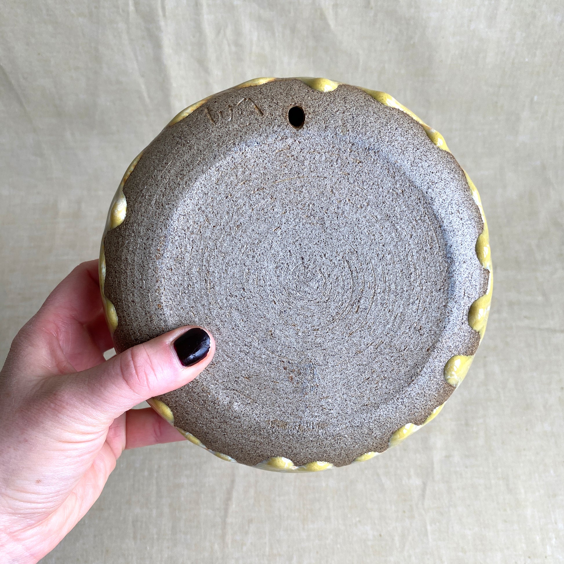 Yellow Giraffe är en handgjord, drejad keramikskål med två gula glasyrer som när de smälter samman skapar ett unikt giraffliknande mönster. Med en grå chamotterad stengodslera känns skålen både rustik och elegant på samma gång.
