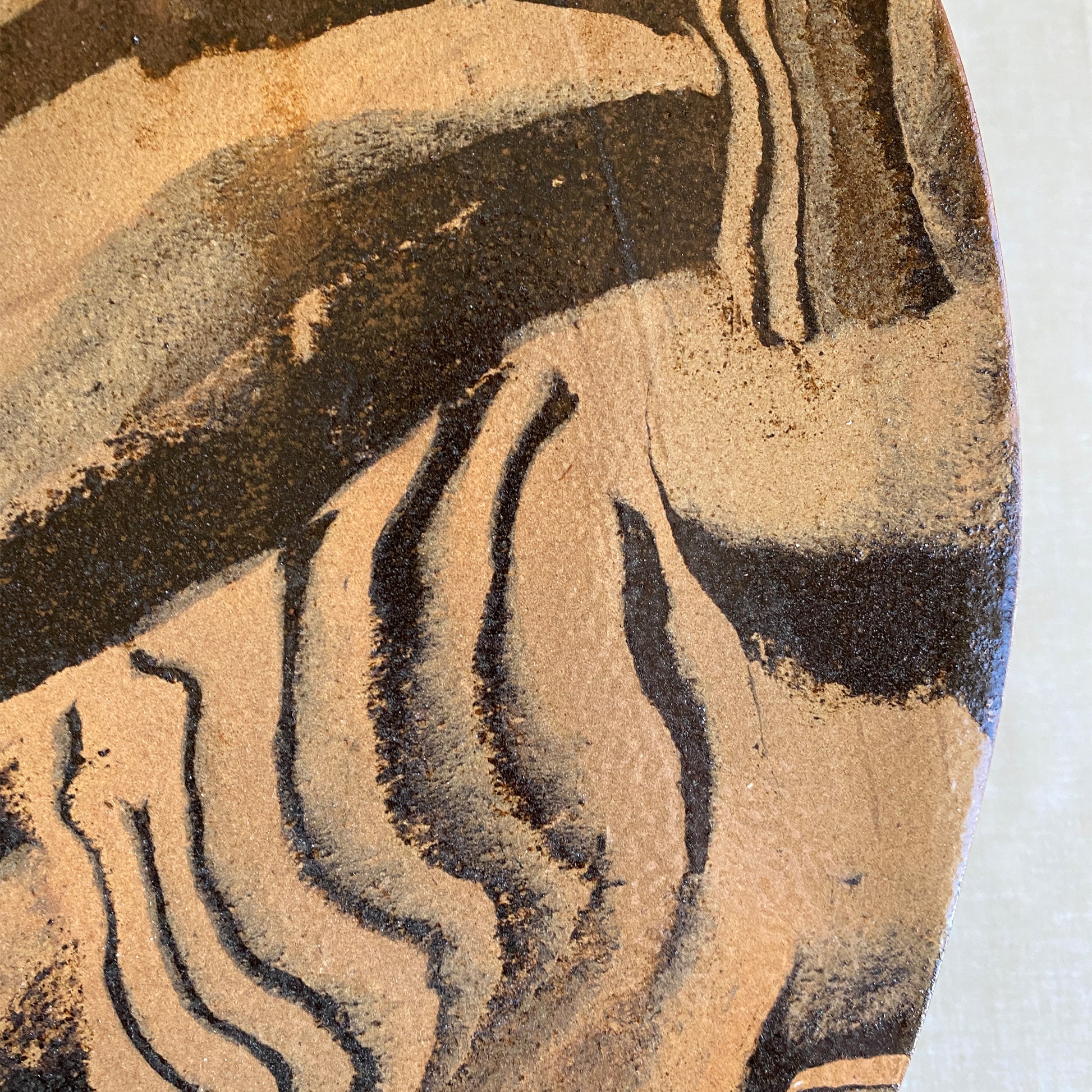Earth är en stor handgjord ostbricka där jordiga toner av brun och svart lera slingrar sig genom varandra. Brickans droppform med ett runt hål gör den lika funktionell som dekorativ då den även kan hängas på väggen.