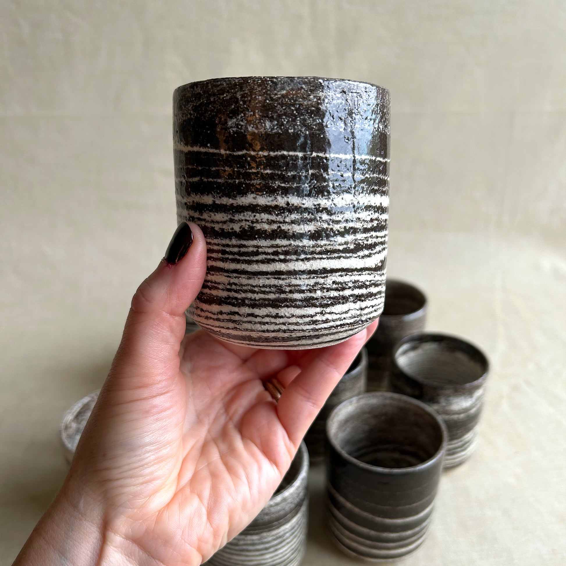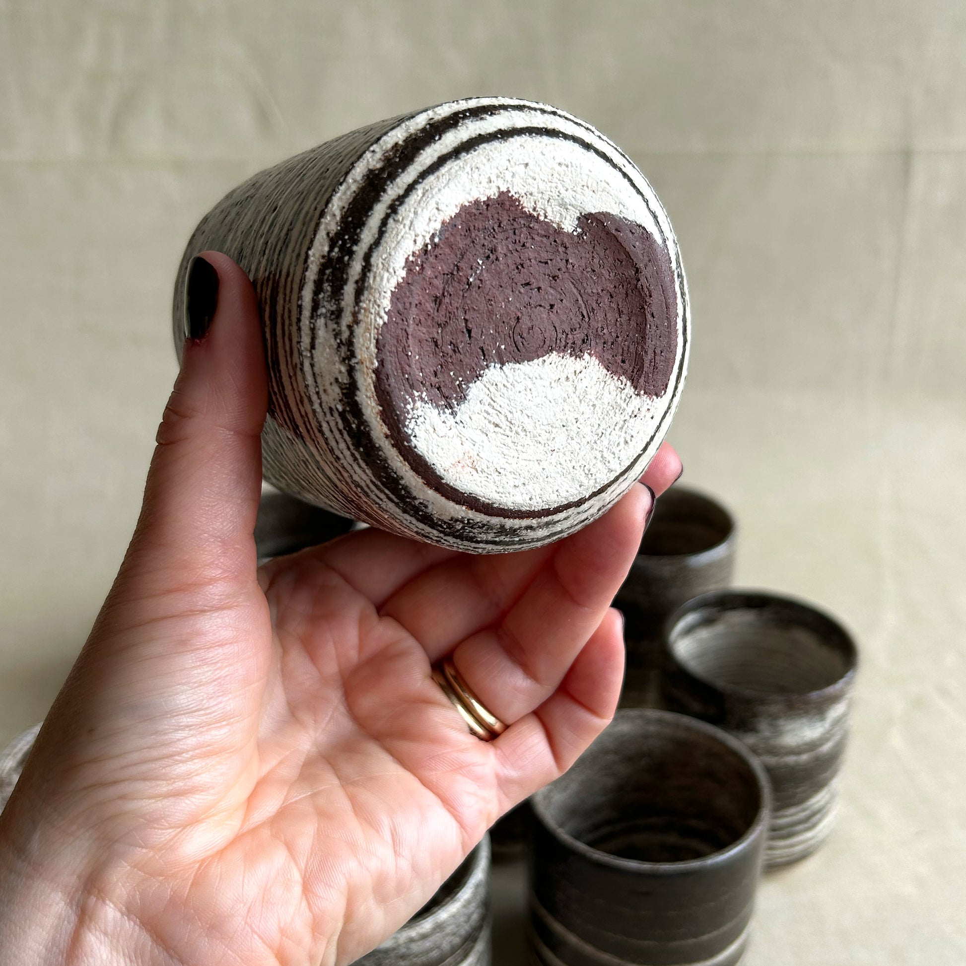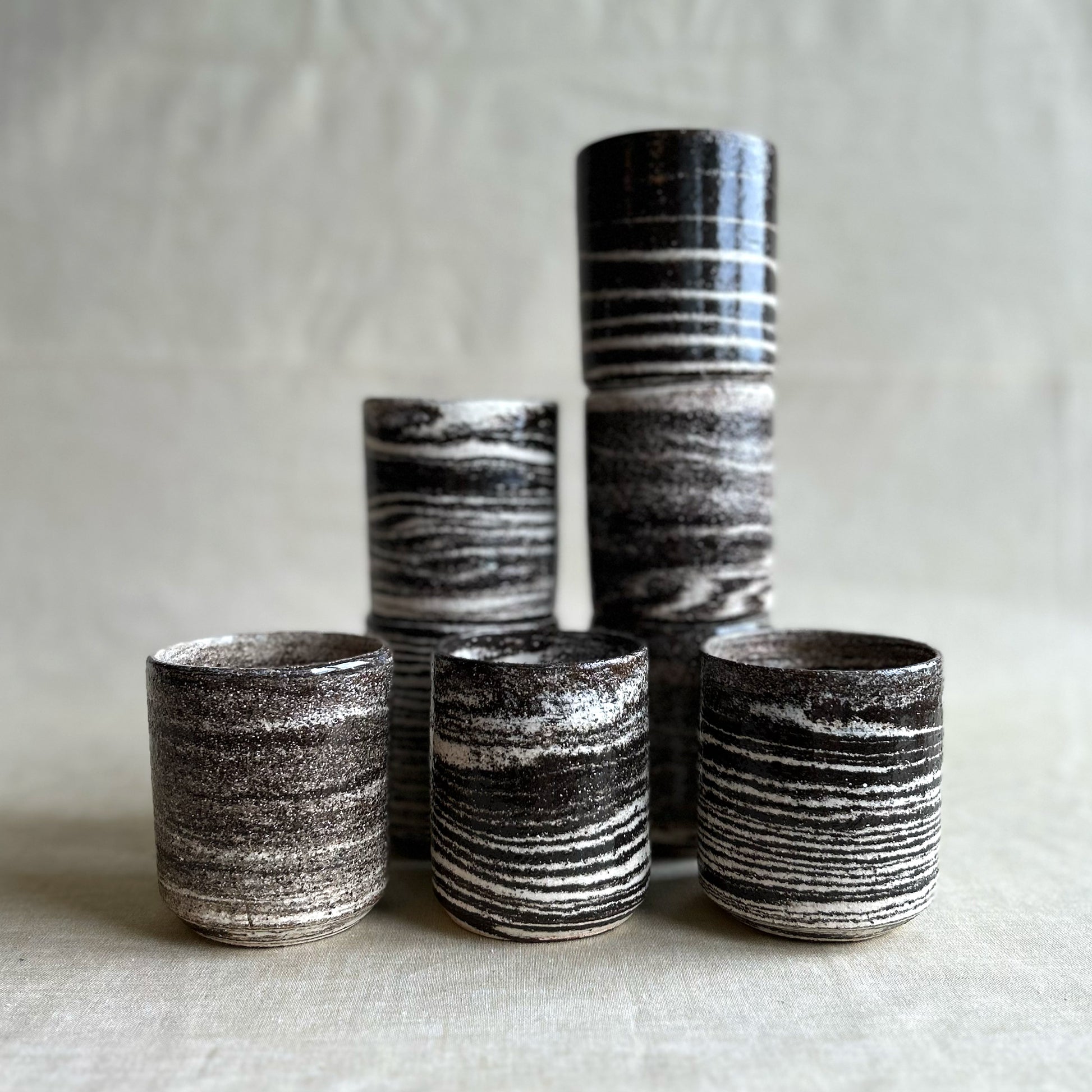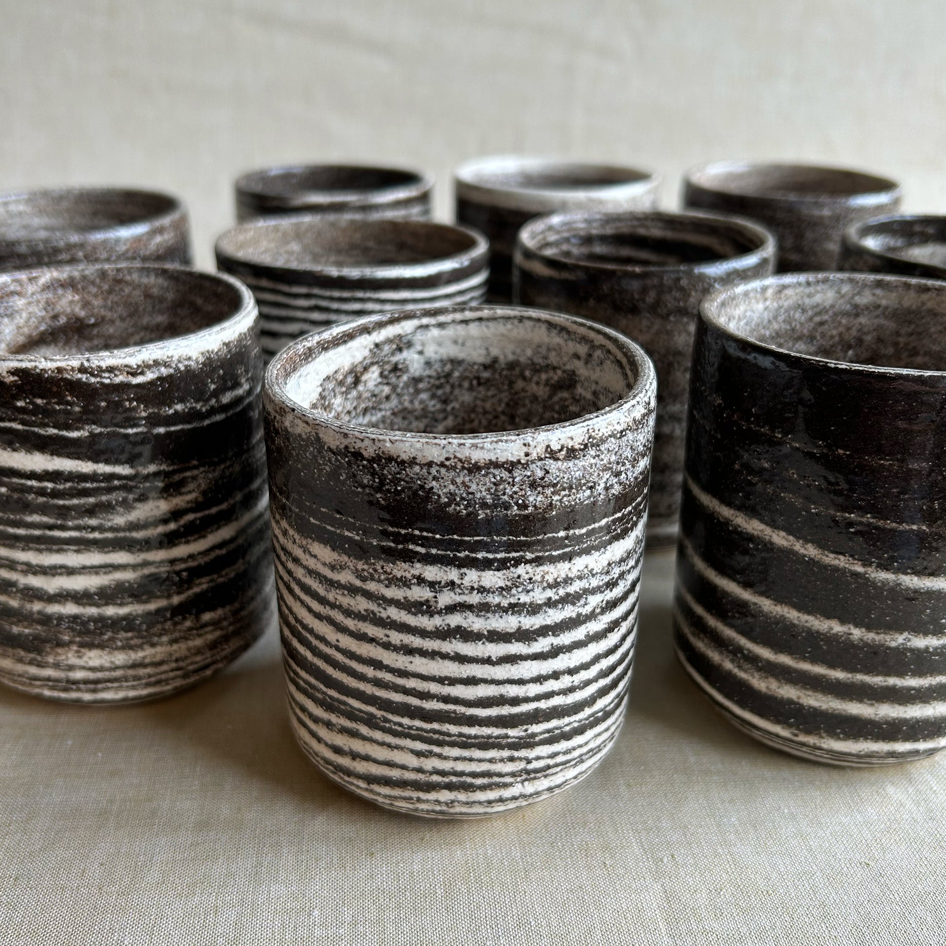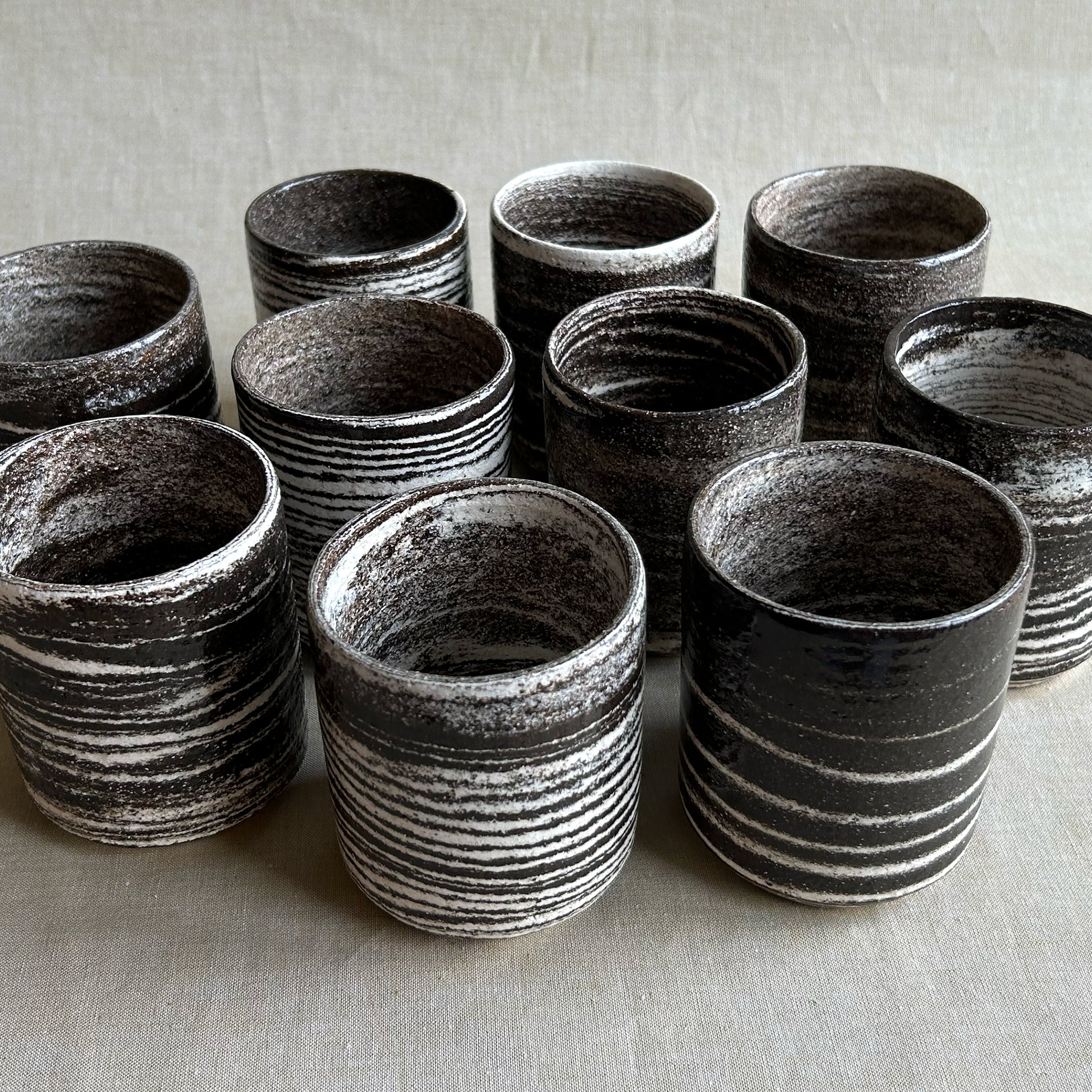 Zebra är en drejad kaffekopp där två olikfärgade leror – vit och mörkbrun – har drejats ihop och på så sätt bildat det randiga mönstret. Lerorna är chamotterade och grova i sin känsla, men den blanka transparenta glasyren över gör kaffekopparna lena mot handen och läpparna.