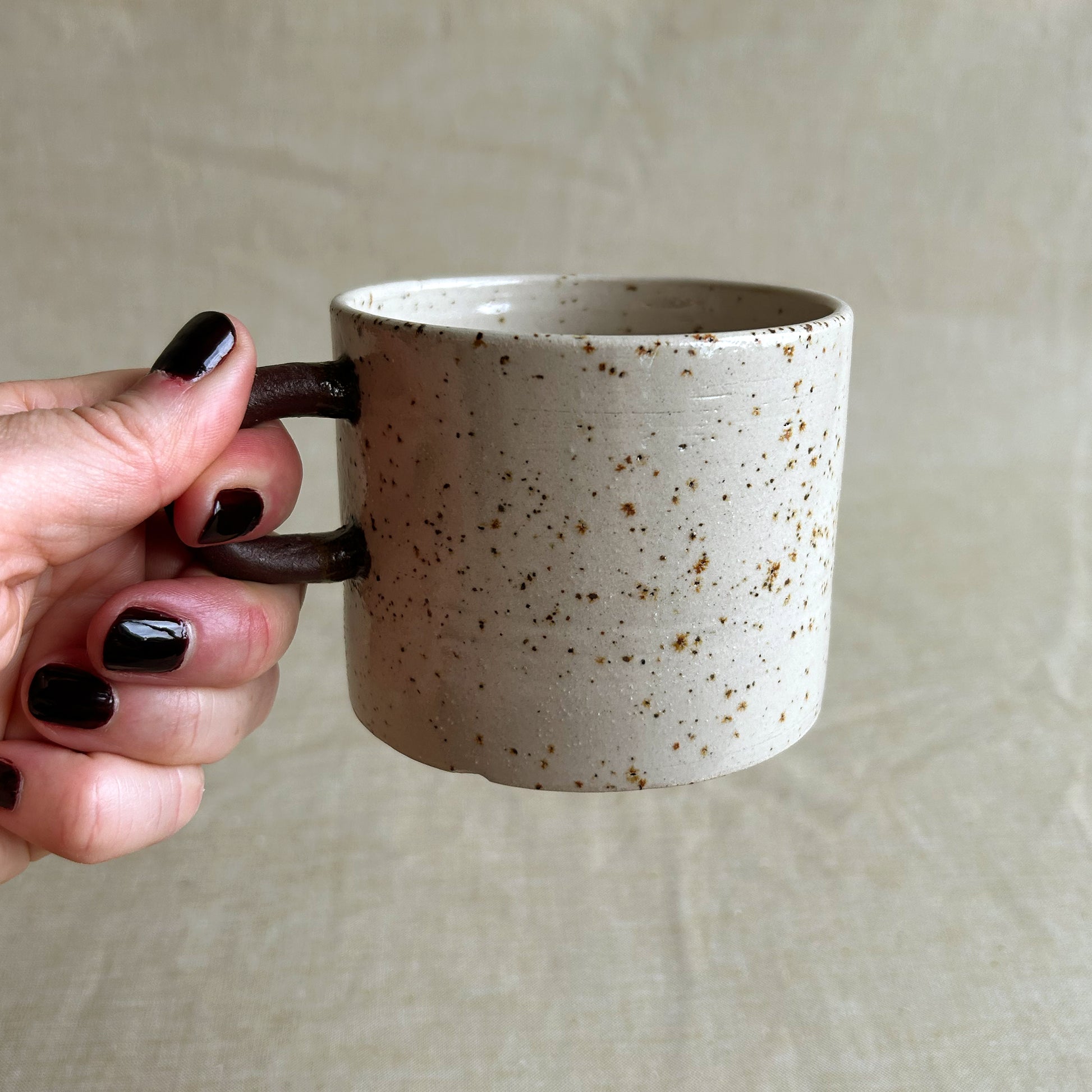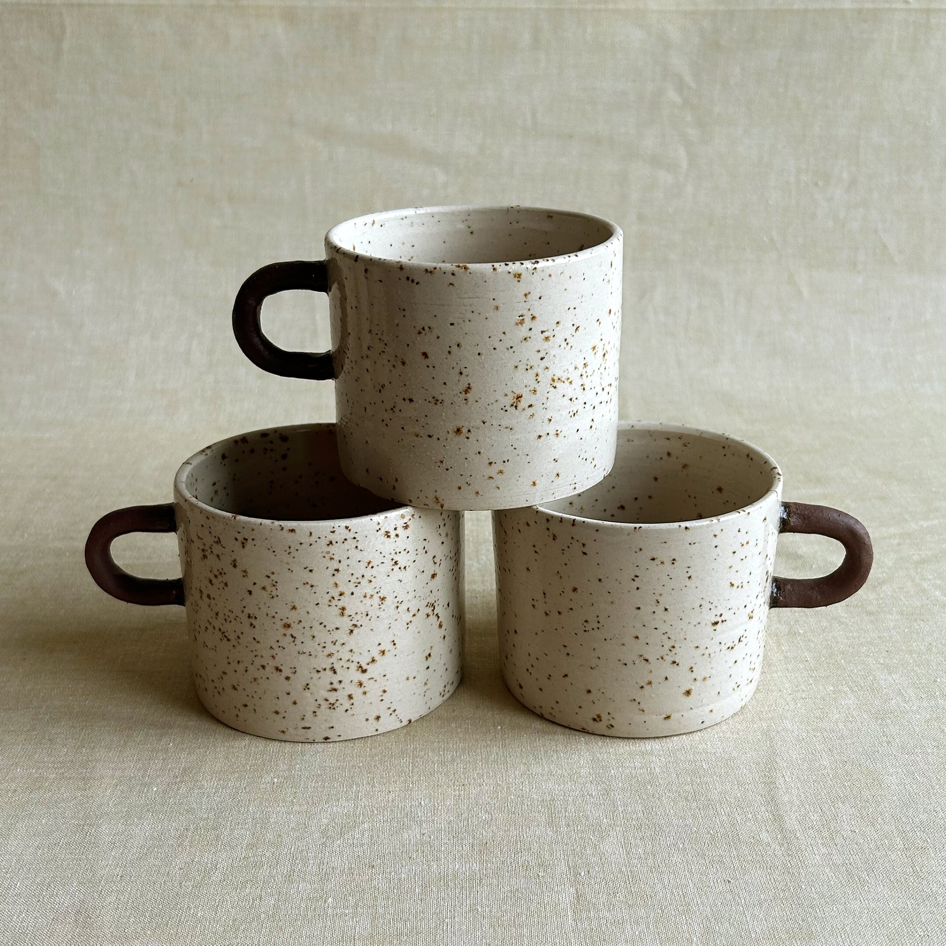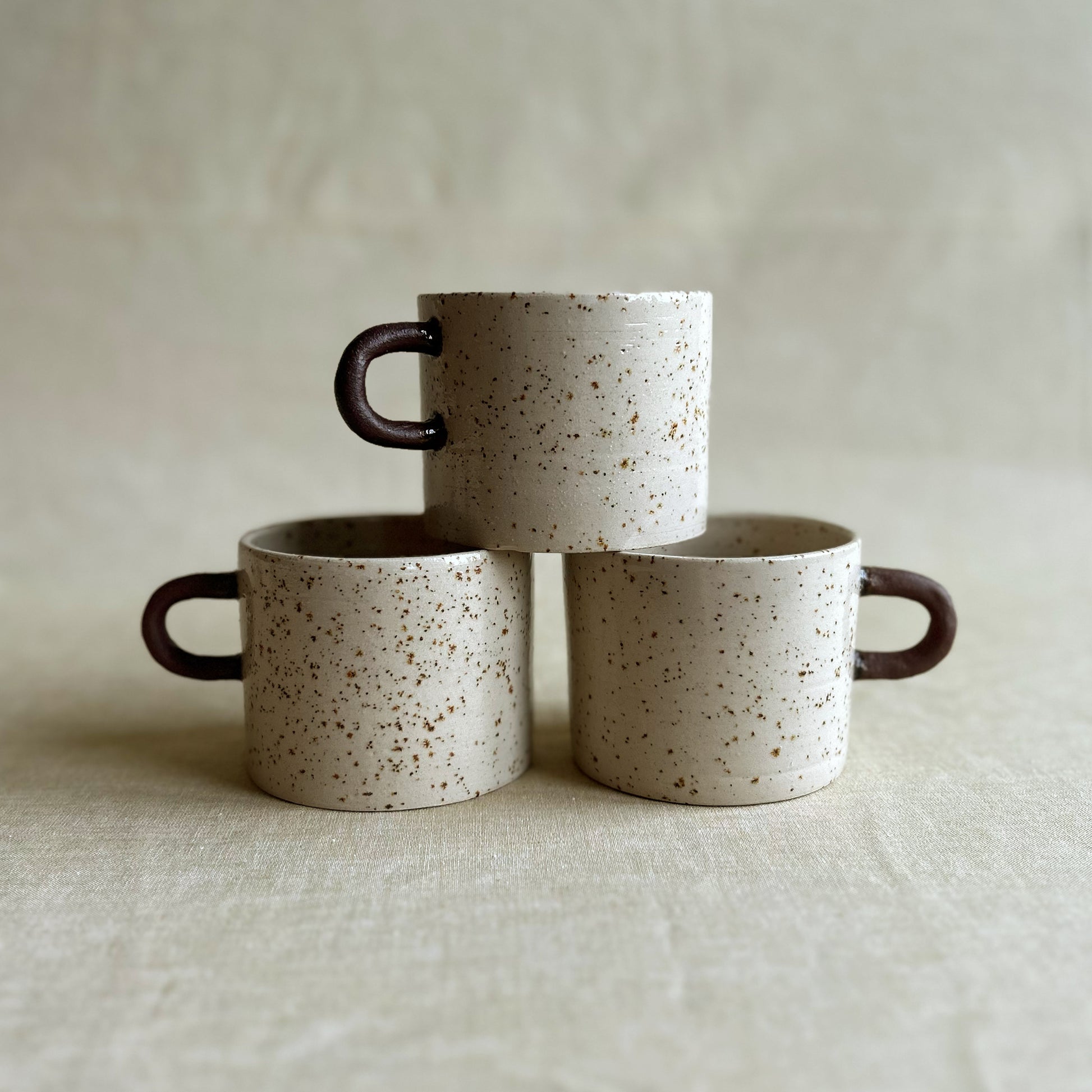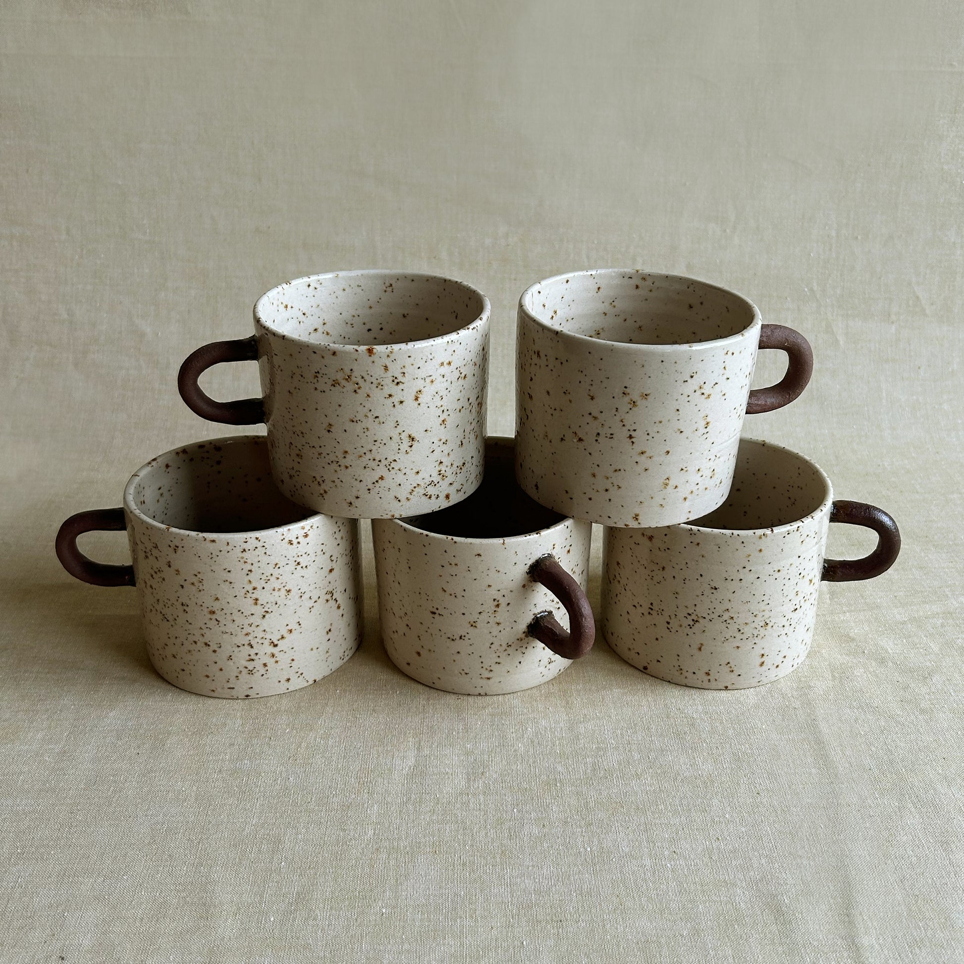 Sandstone är en drejad kaffekopp i lavalera med ett mindre öra i mörkbrun lera. Med sina tunna väggar och den blanka transparenta glasyren över känns koppen lätt och len mot läpparna.