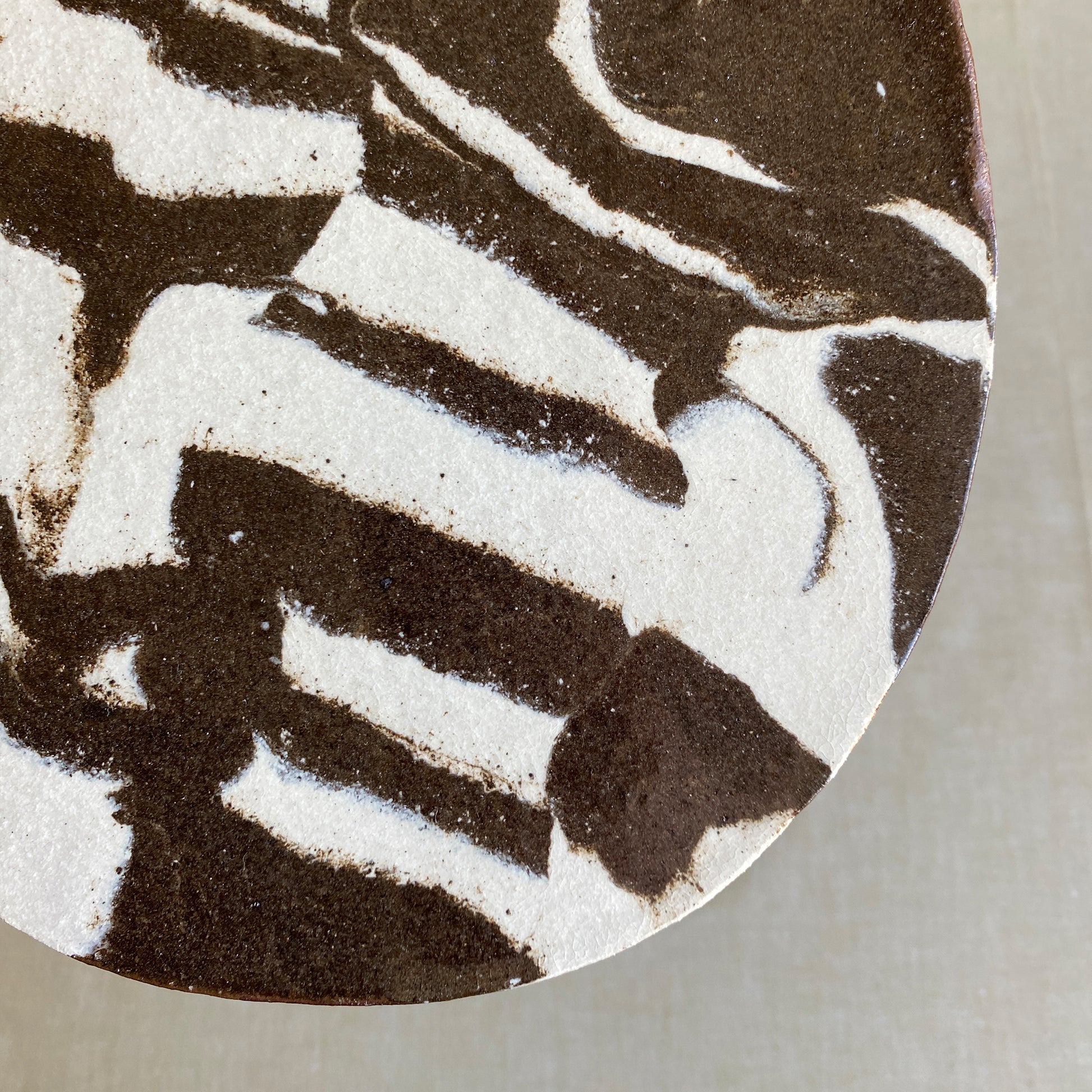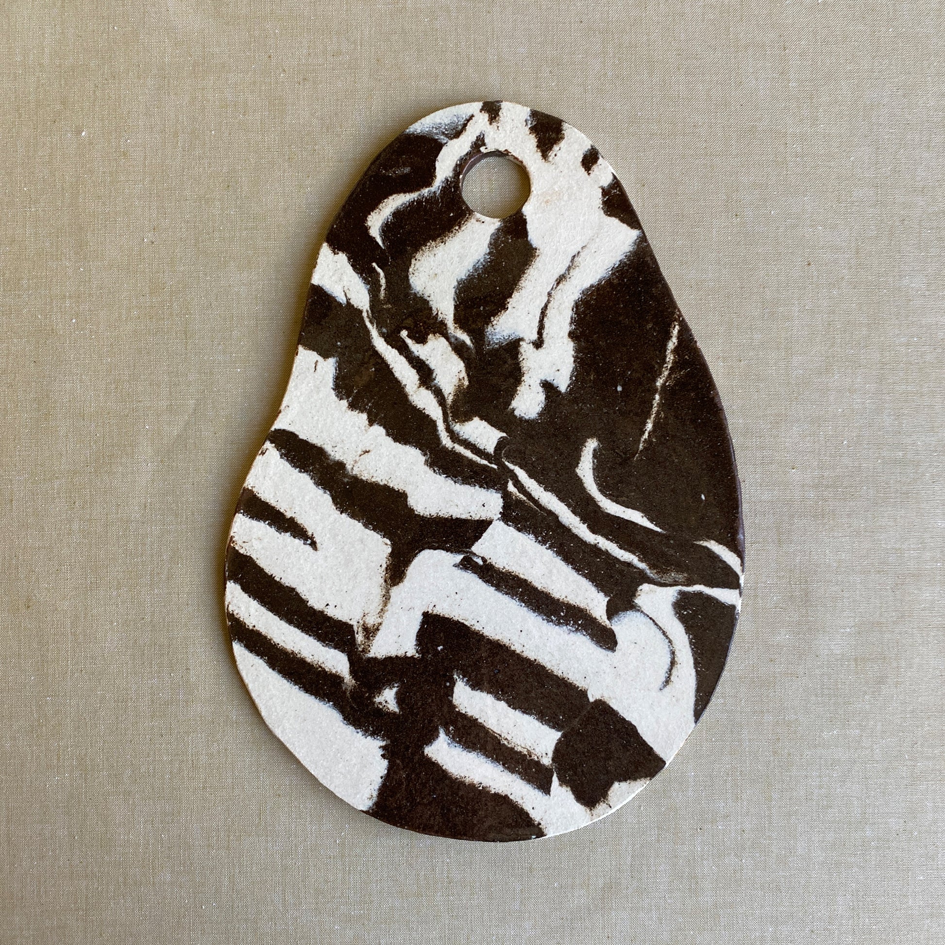 Orbit är en handgjord, kavlad ostbricka med ett grafiskt mönster skapat av kontrasten mellan mörk och ljus lera.