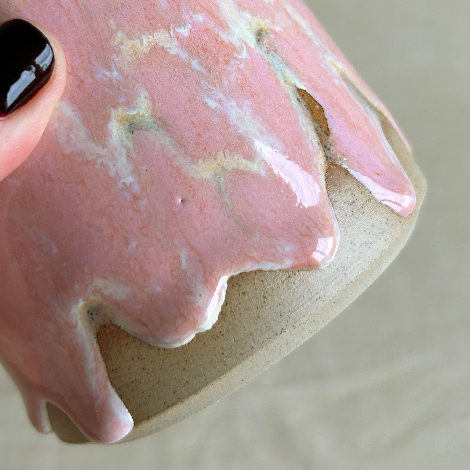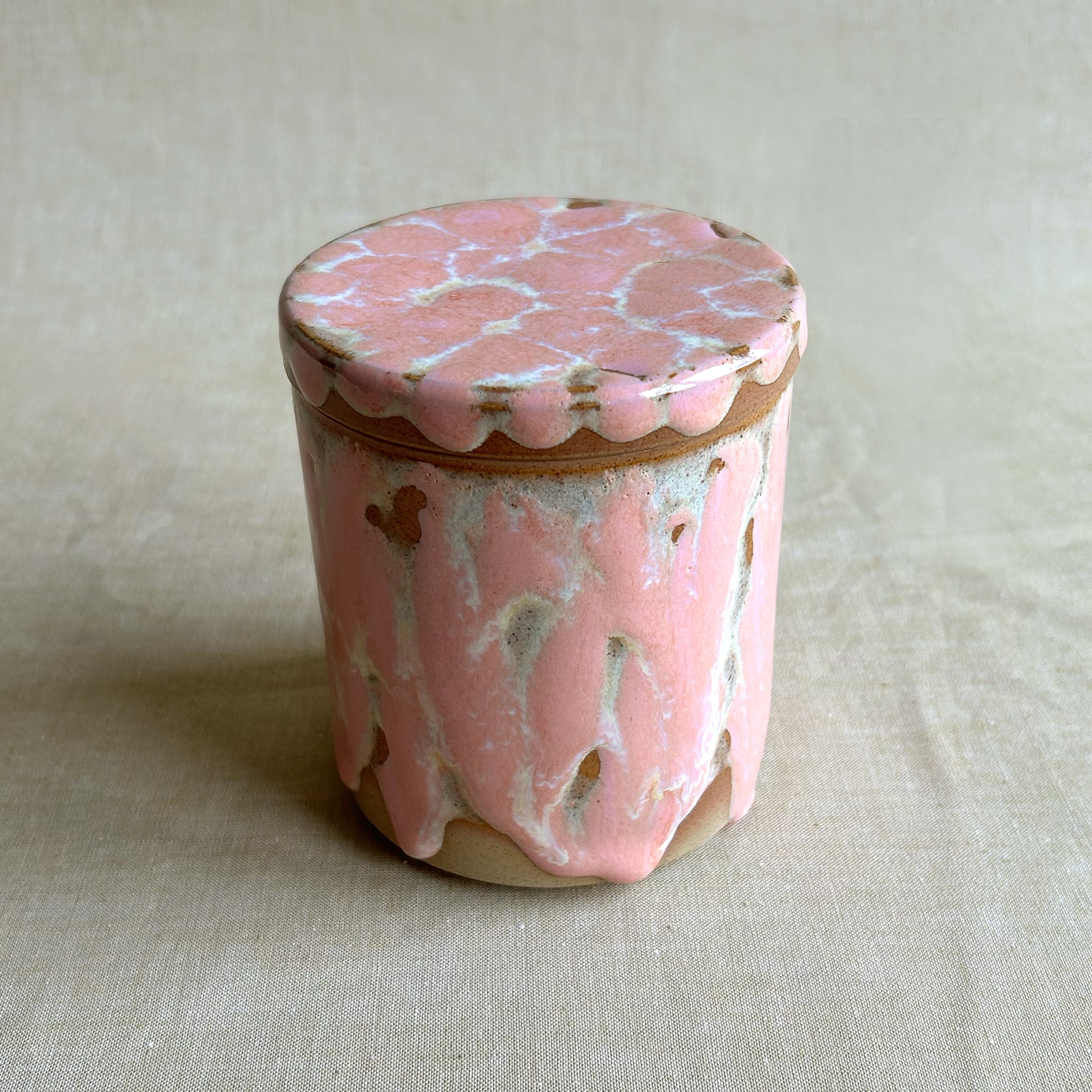Sorbet Swirl är en handgjord, drejad smörklocka med glasyr som påminner om smält glass – mjuka rosa och orangea toner flyter samman med citrongula inslag och skapar ett lekfullt, organiskt mönster.