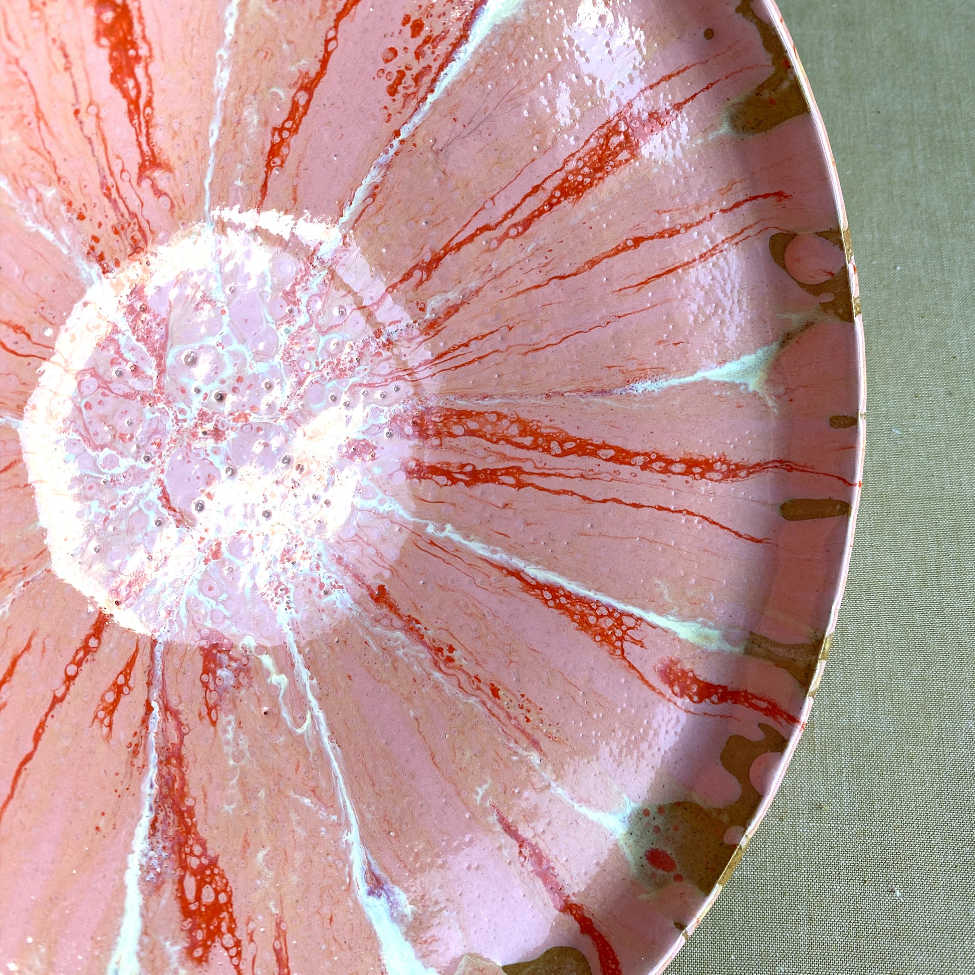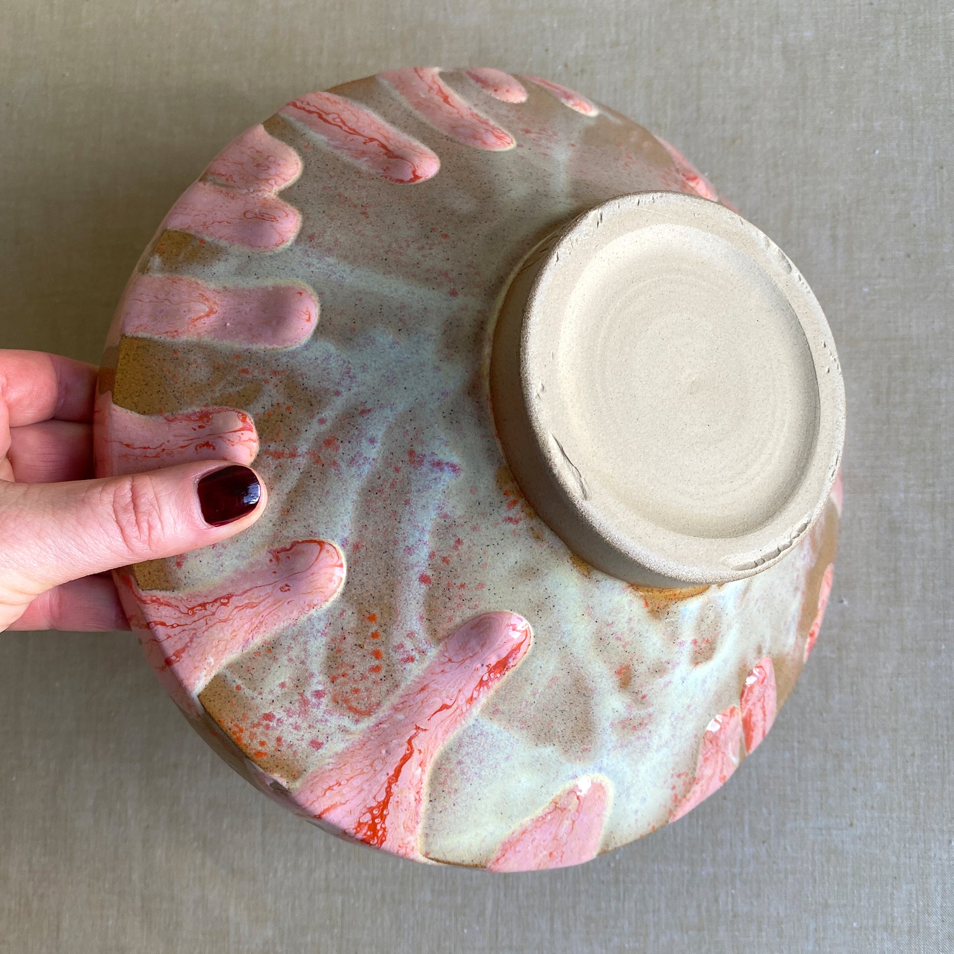 Likt smält sorbet har denna skål ett virvlande mönster i mjuka rosa och krämiga toner, med inslag av livfulla, orangea färgstänk. Varje exemplar är unikt, format för hand på drejskiva och glaserat med en teknik som skapar en smält glass-effekt – en perfekt balans mellan spontanitet och precision. Använd den som fruktfat, till servering av sallad, pasta eller som en dekorativ detalj i ditt hem.