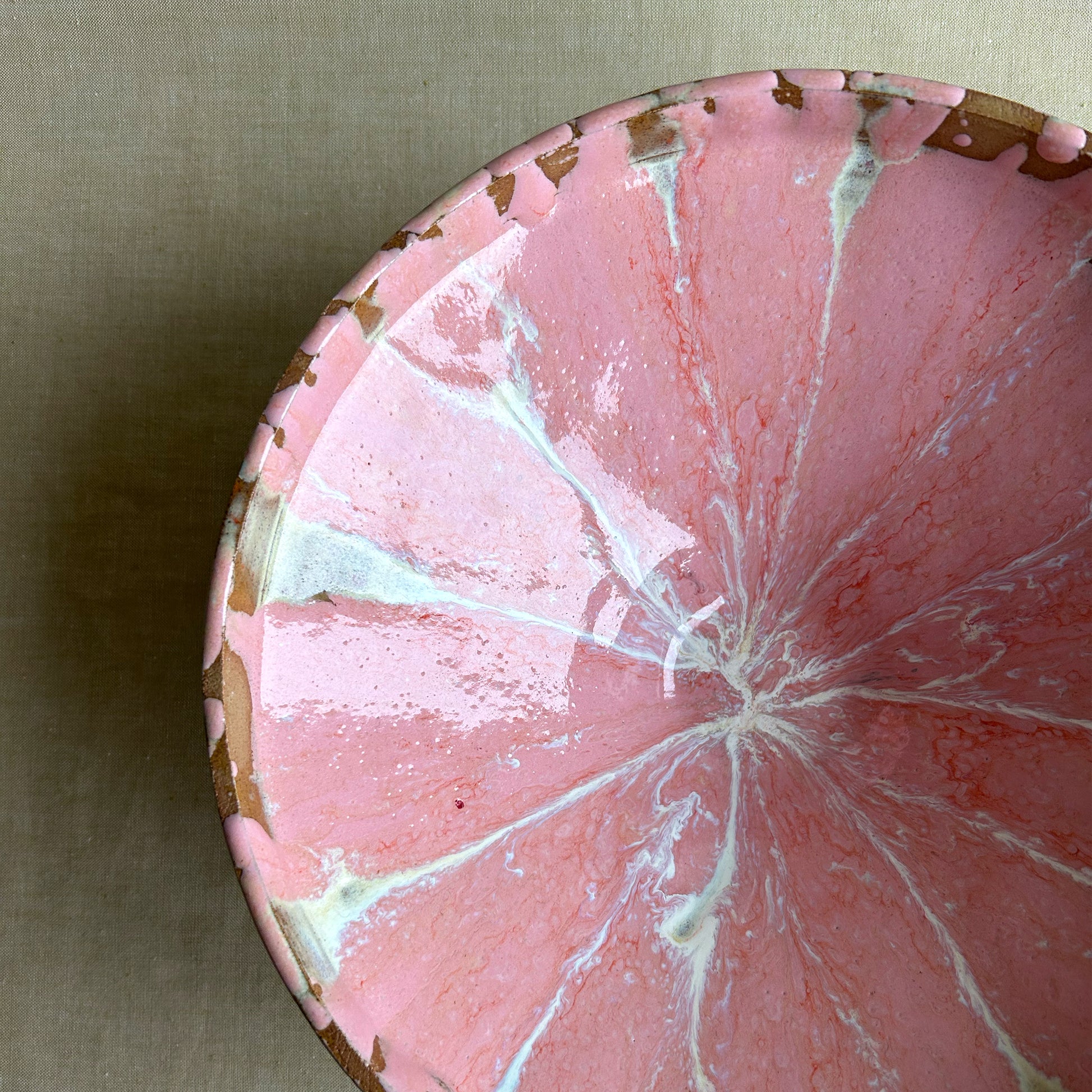 Likt smält sorbet har denna skål ett virvlande mönster i mjuka rosa och krämiga toner, med inslag av livfulla, orangea färgstänk. Varje exemplar är unikt, format för hand på drejskiva och glaserat med en teknik som skapar en smält glass-effekt. Använd den som fruktfat, till servering av sallad eller som en dekorativ detalj i ditt hem.
