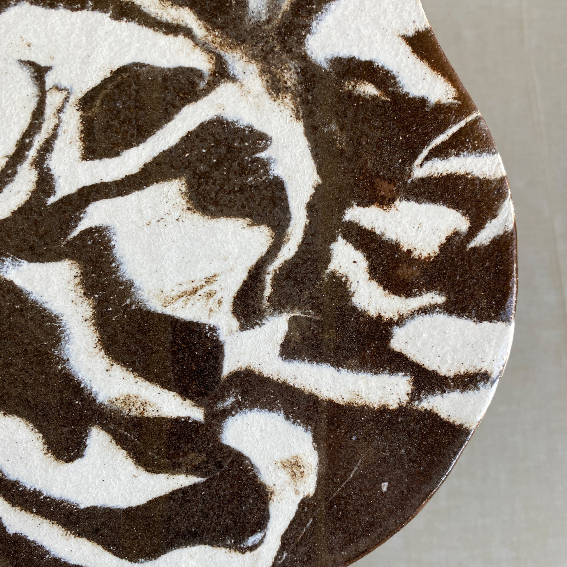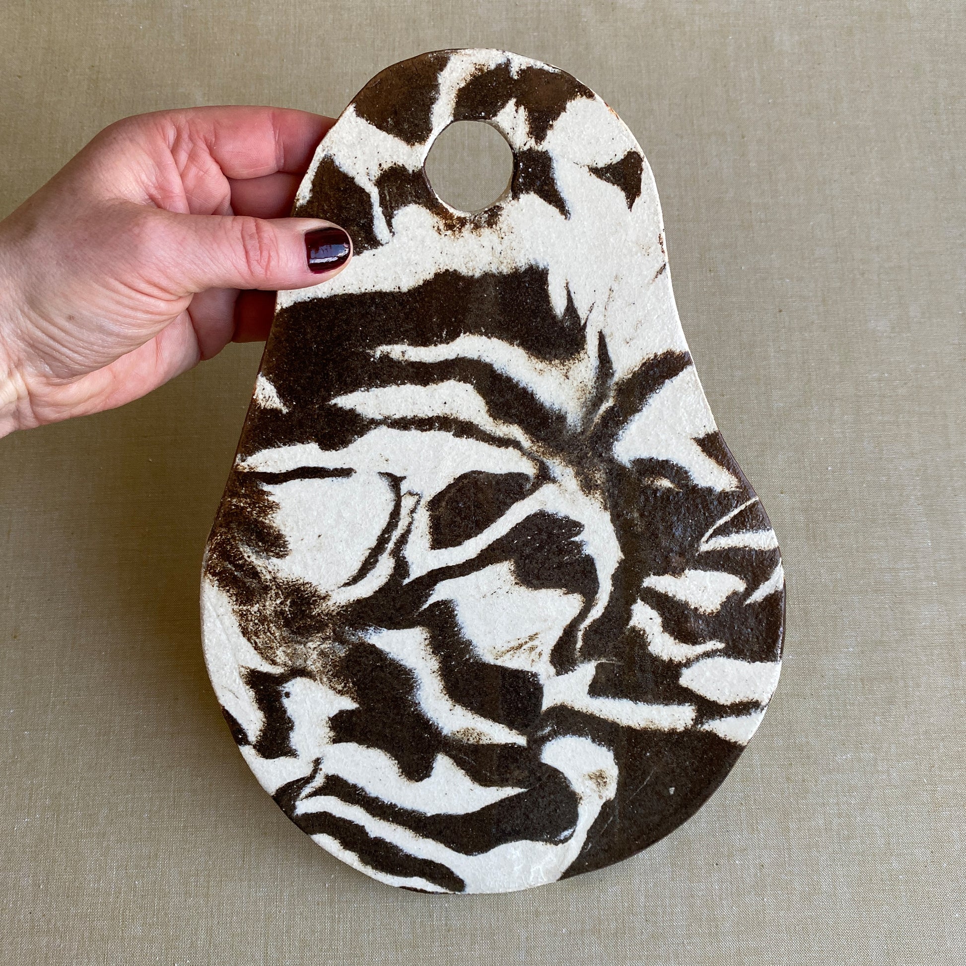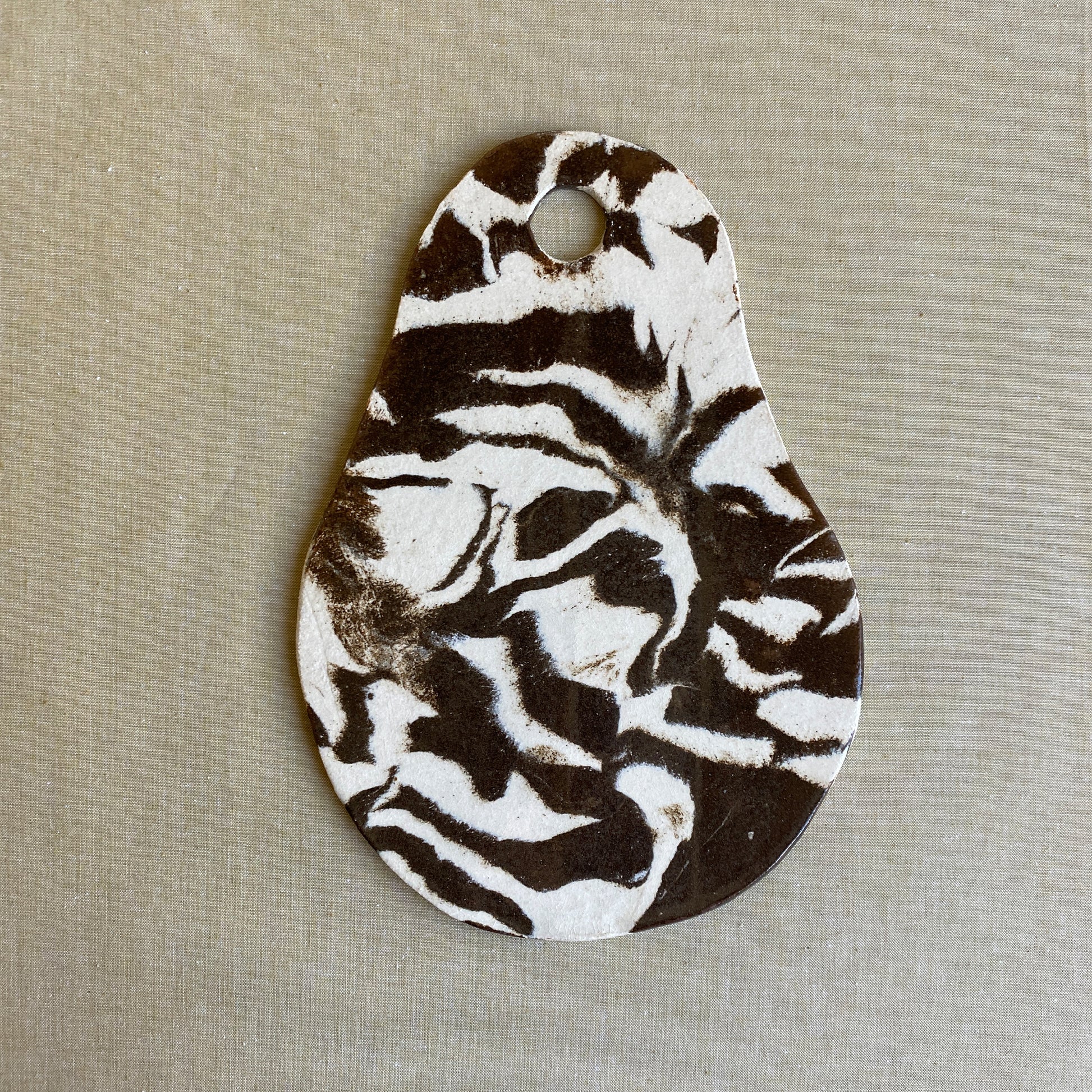 Uranus är en handgjord, kavlad ostbricka med ett abstrakt, grafiskt mönster skapat av kontrasten mellan mörk och ljus lera.