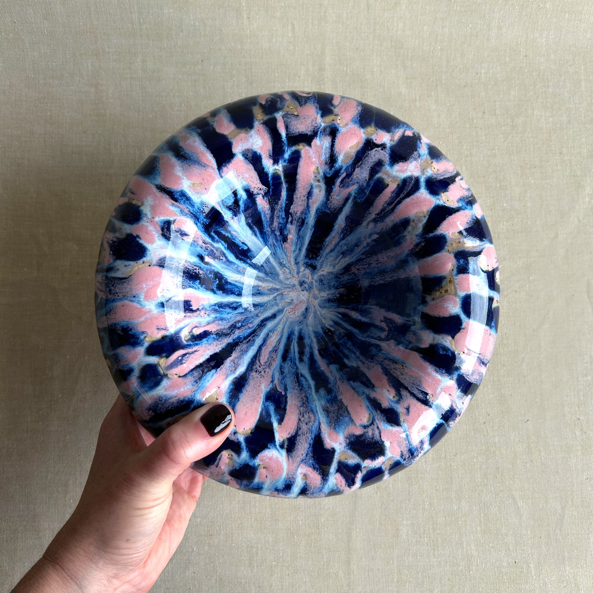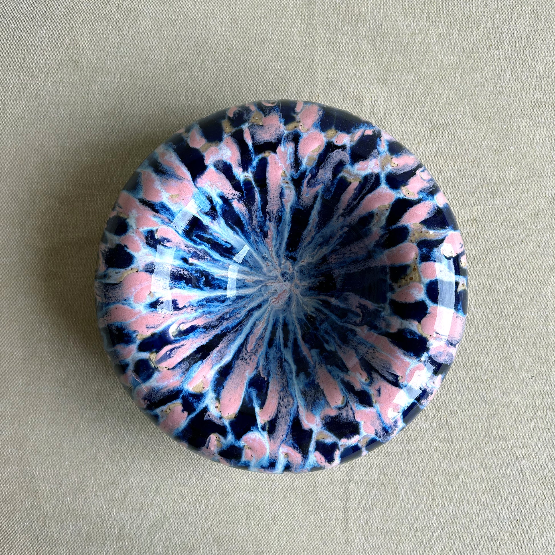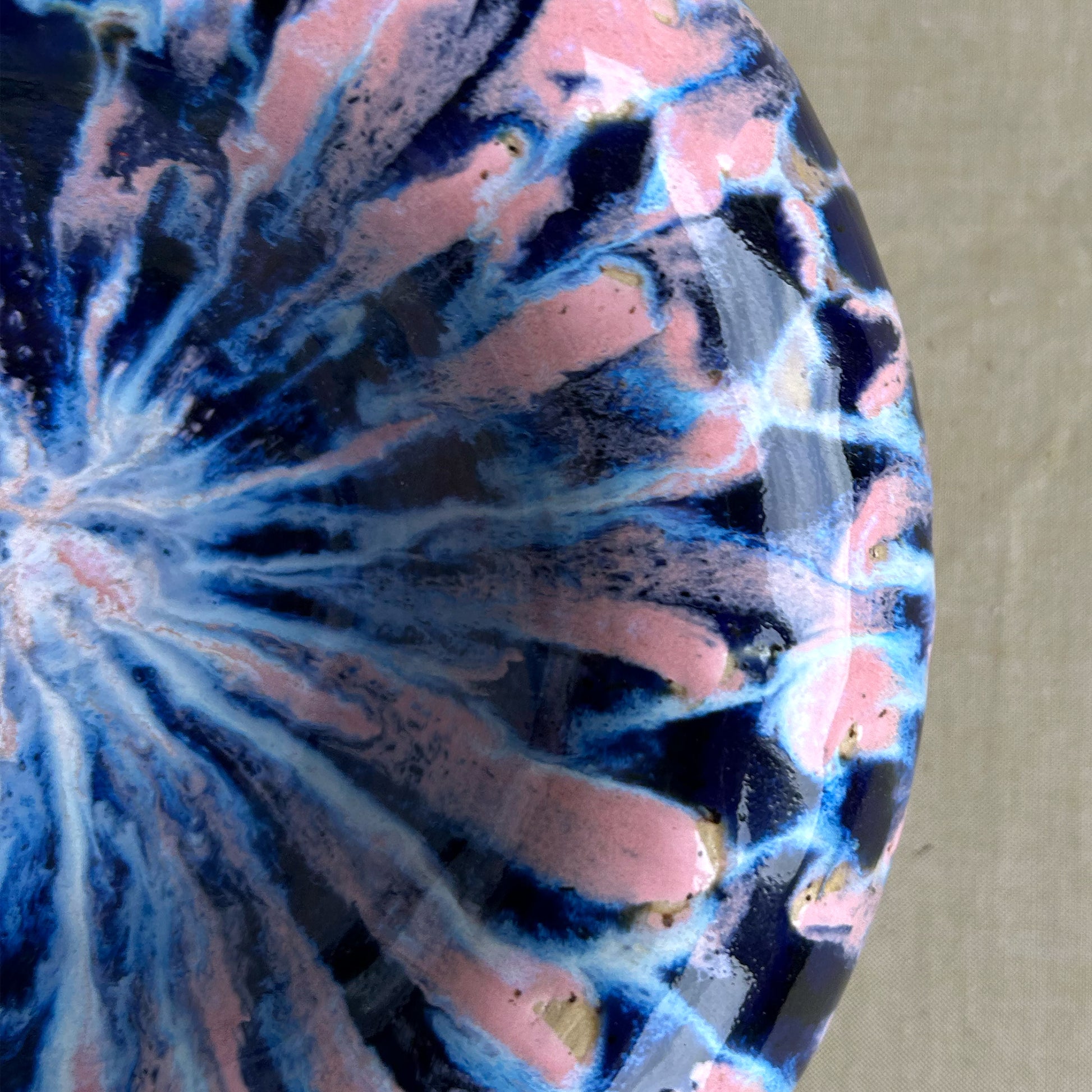 Pink Leopard är en unik handgjord keramikskål/väggkonst med en livfull glasyr i djupa blå toner, ljusa vita stråk och rosa inslag.