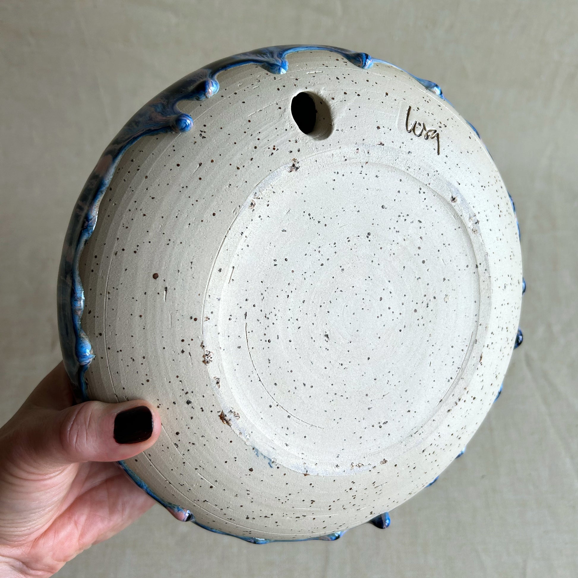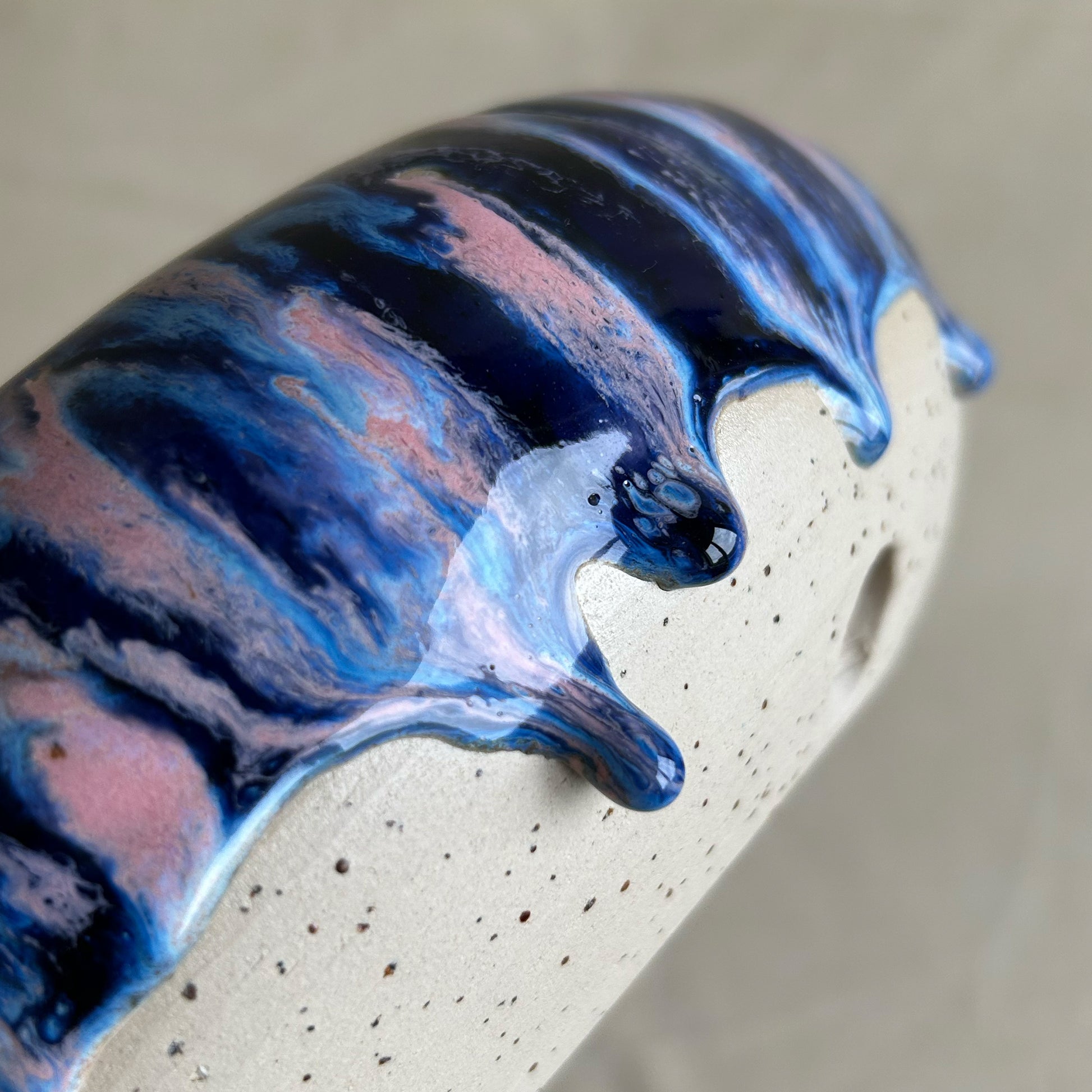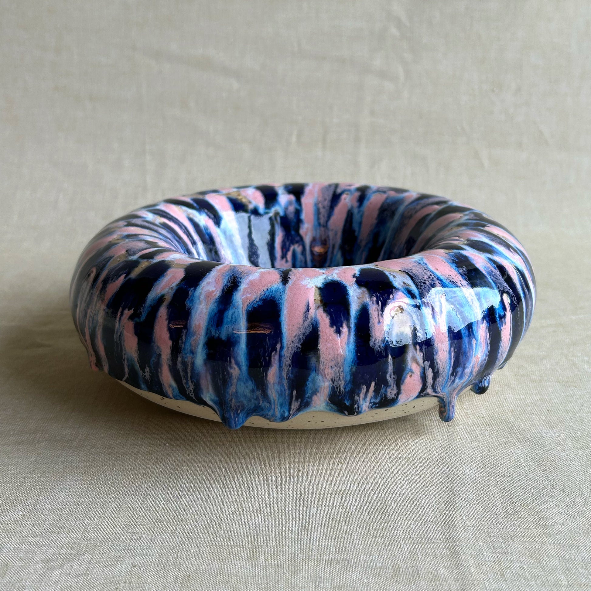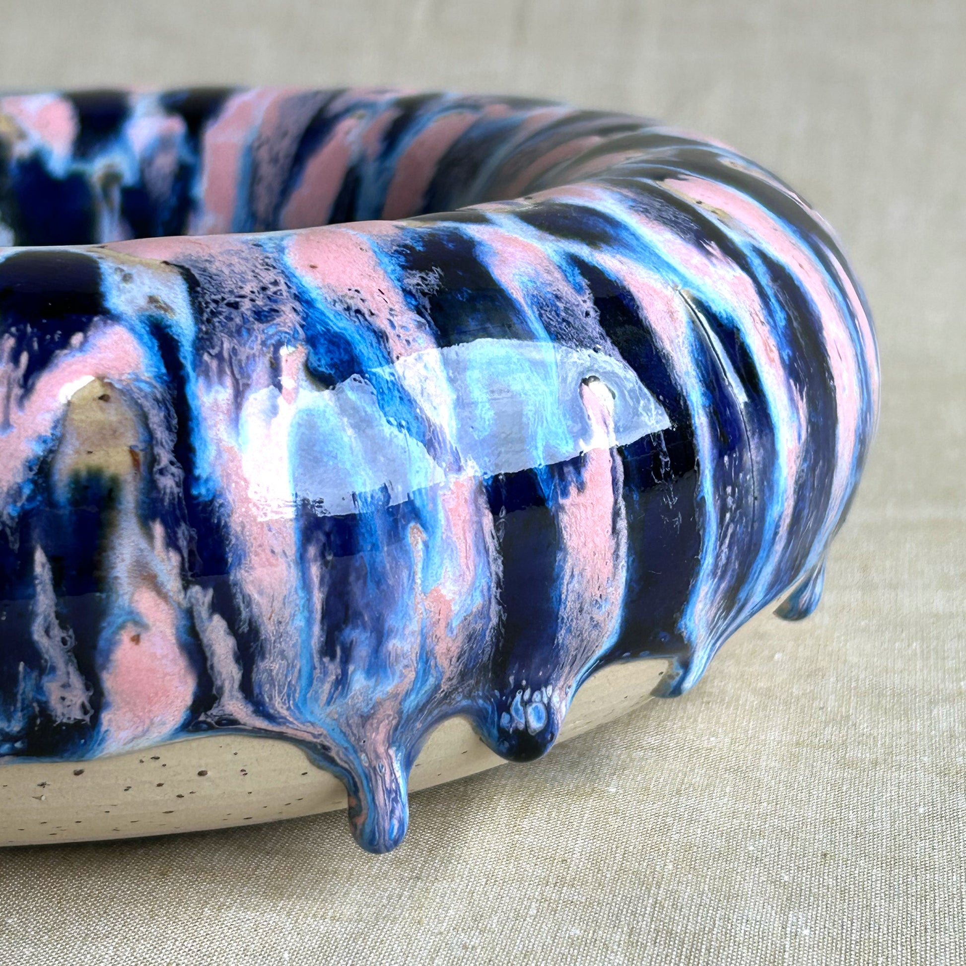 Pink Leopard är en unik handgjord keramikskål/väggkonst med en livfull glasyr i djupa blå toner, ljusa vita stråk och rosa inslag.