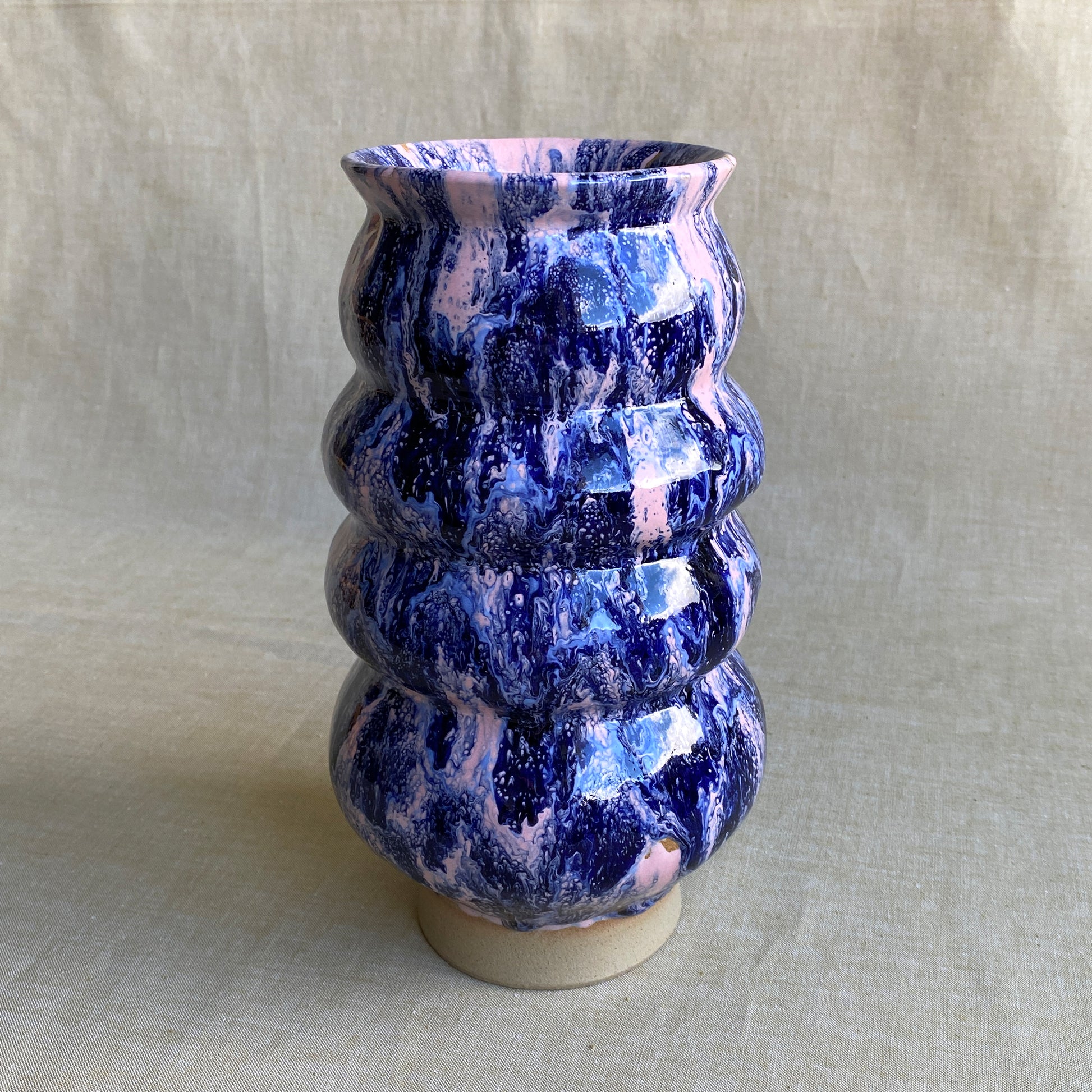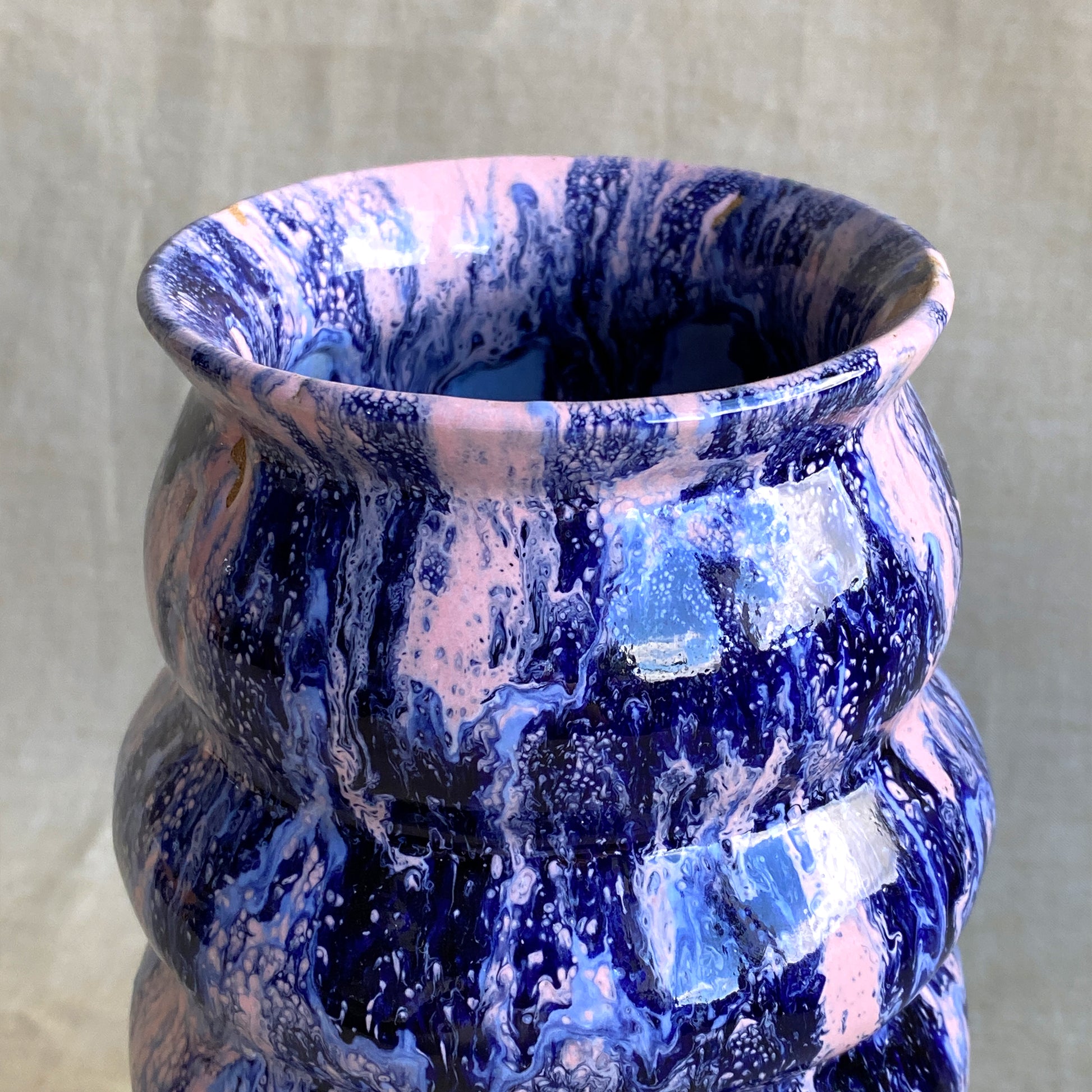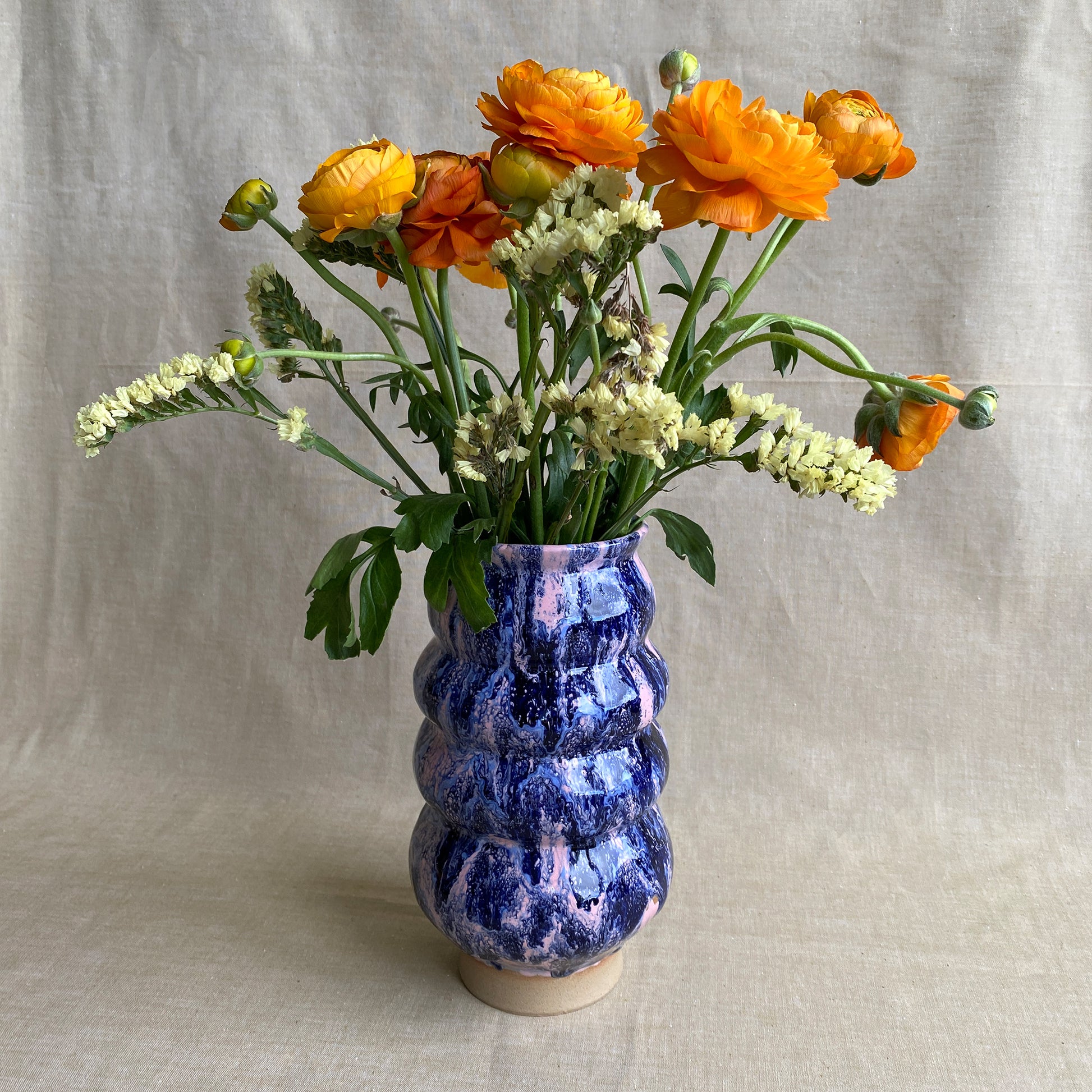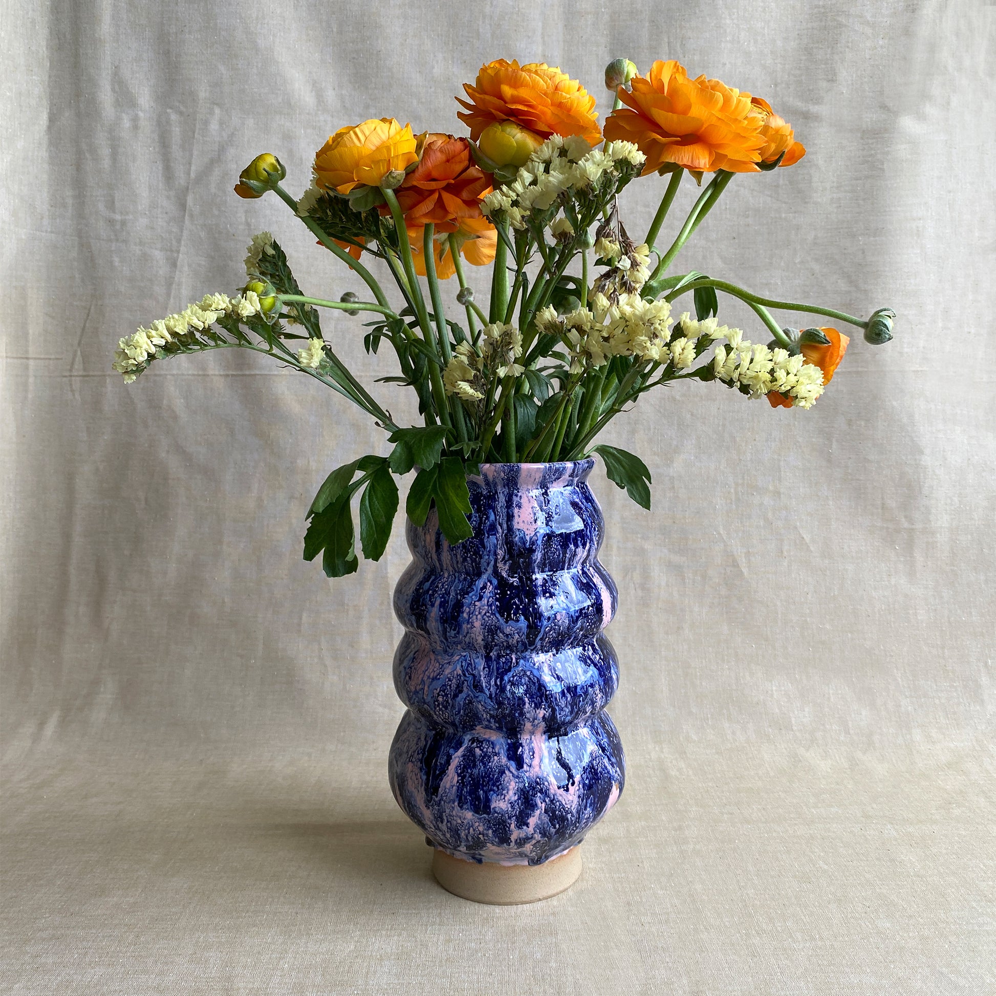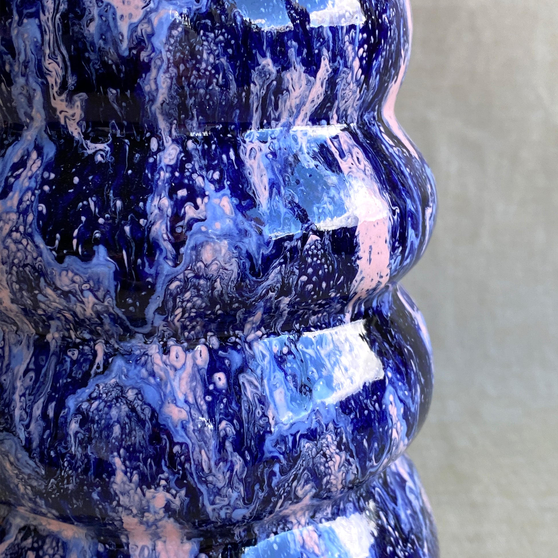 En hypnotisk fusion av djupblå, ljusblå och rosa glasyr som rör sig över ytan likt smält socker. Candy Trance är en handdrejad vas i stengods, där varje bubblig form fångar och reflekterar ljuset på sitt eget sätt. En statement-piece som lyfter allt från en enkel kvist till en färgsprakande bukett – ett unikt hantverk i keramik.