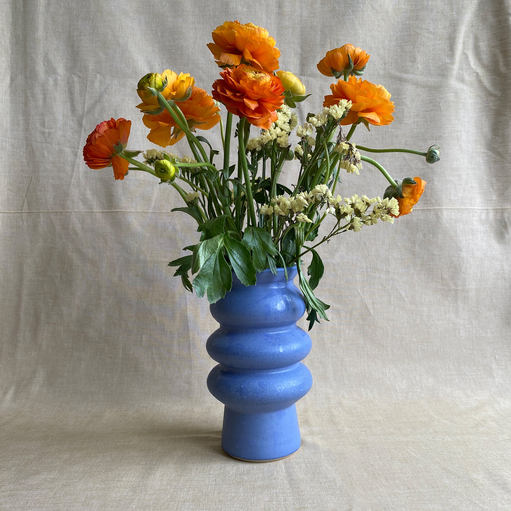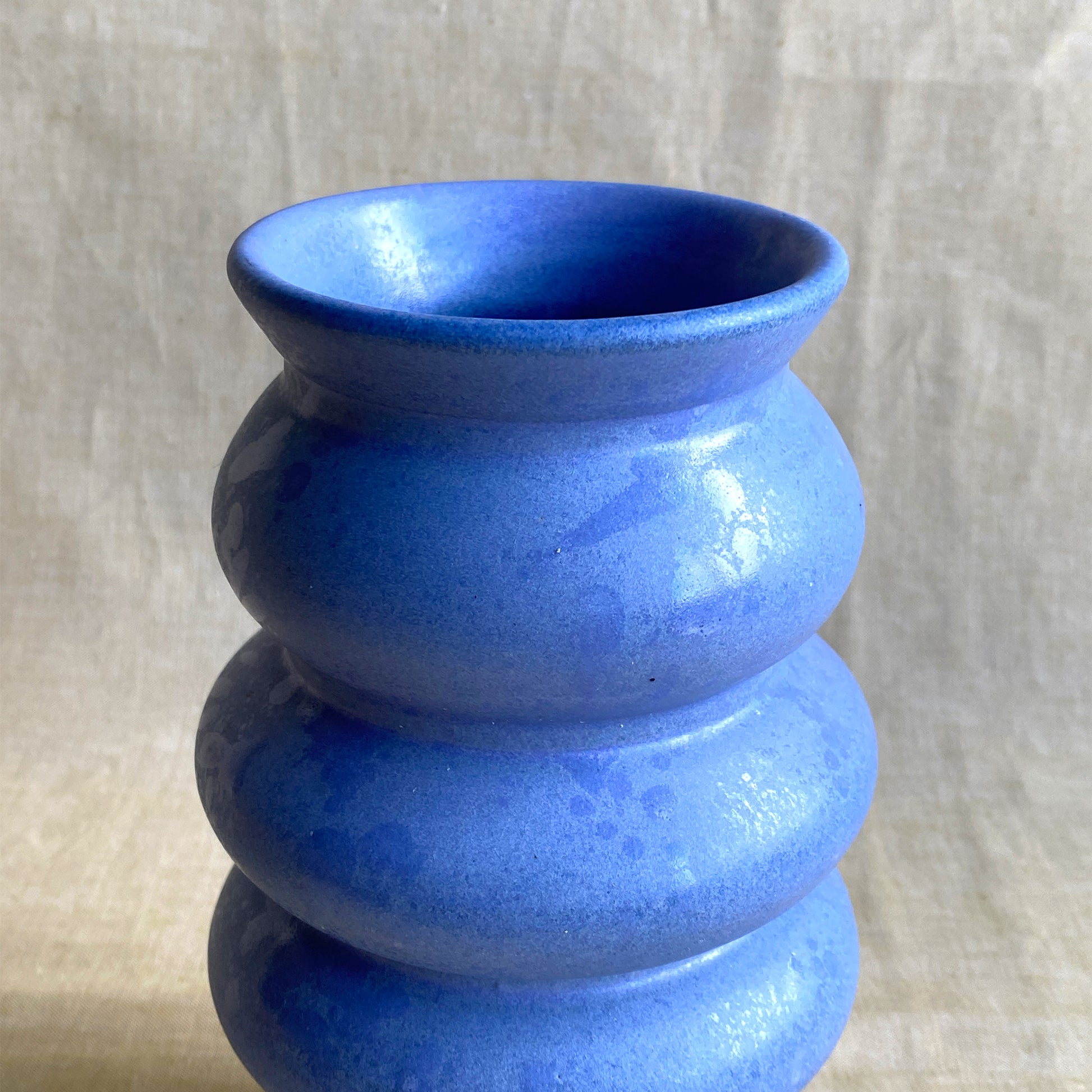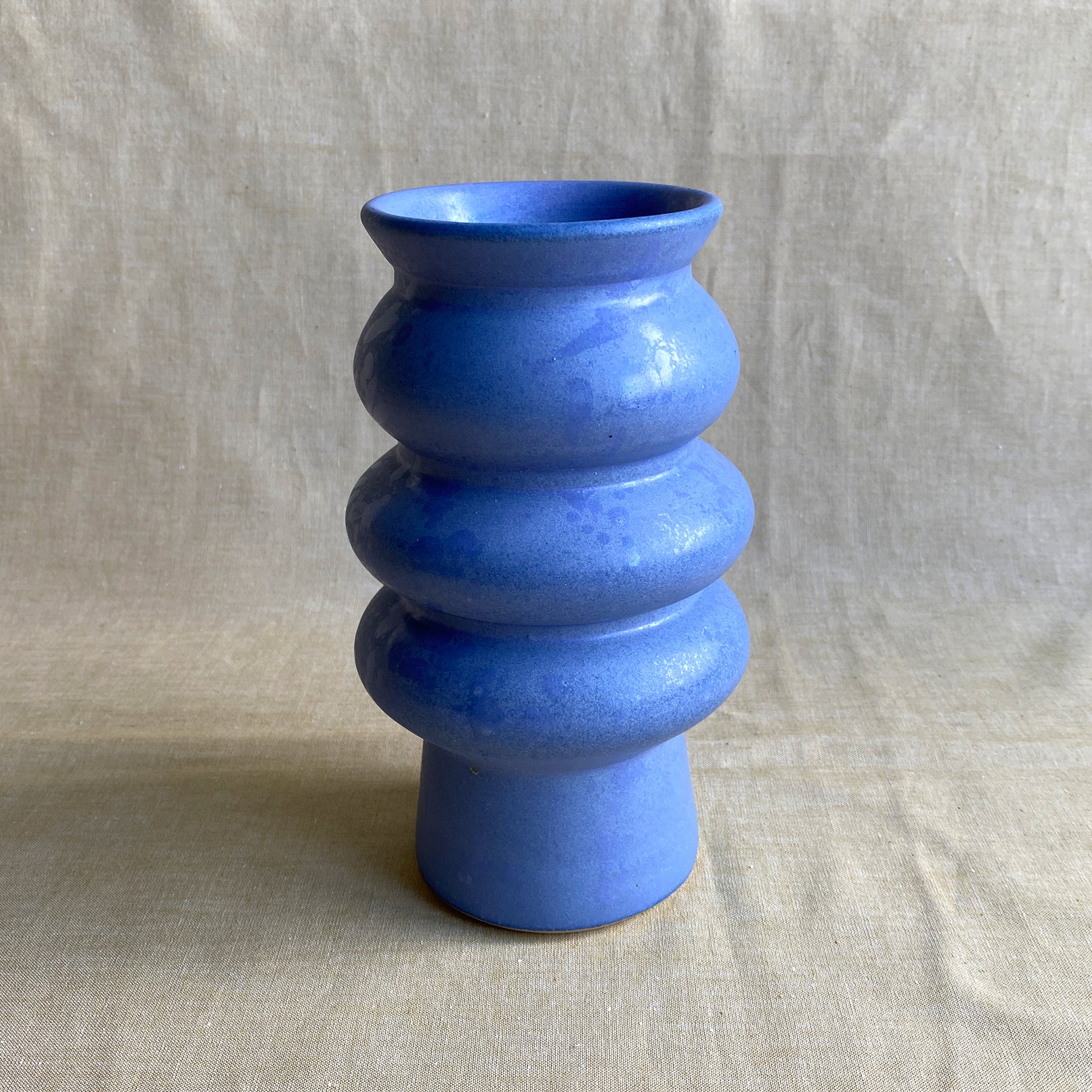 Midnight Glow är en handdrejad vas i stengods med en skimrande sidenmatt blå glasyr kombinerat med vita nästan transparenta stänk. Den bubbliga formen skapar liv och rörelse i vasen – lika självklar med en enkel kvist som med en dramatisk bukett.
